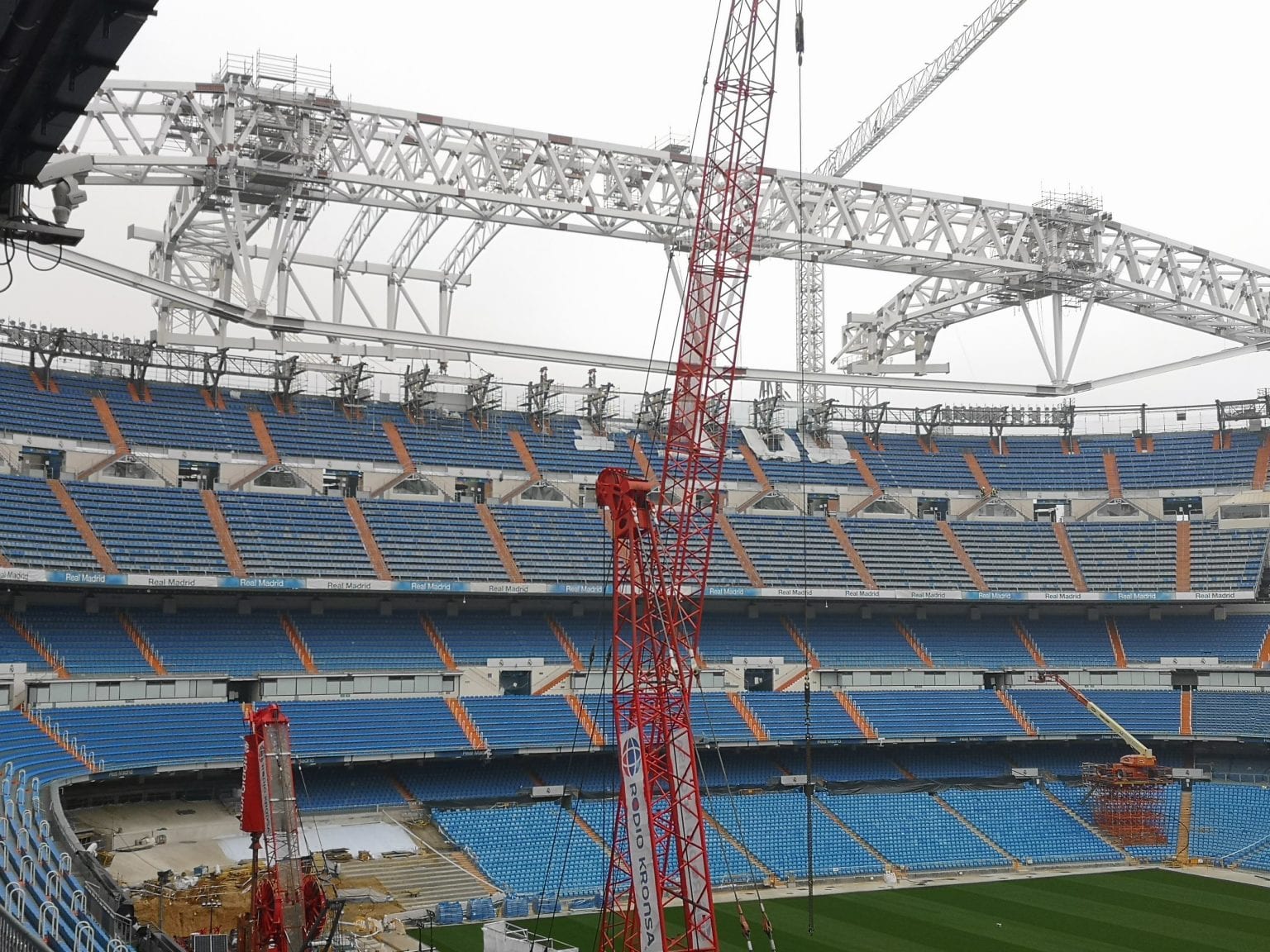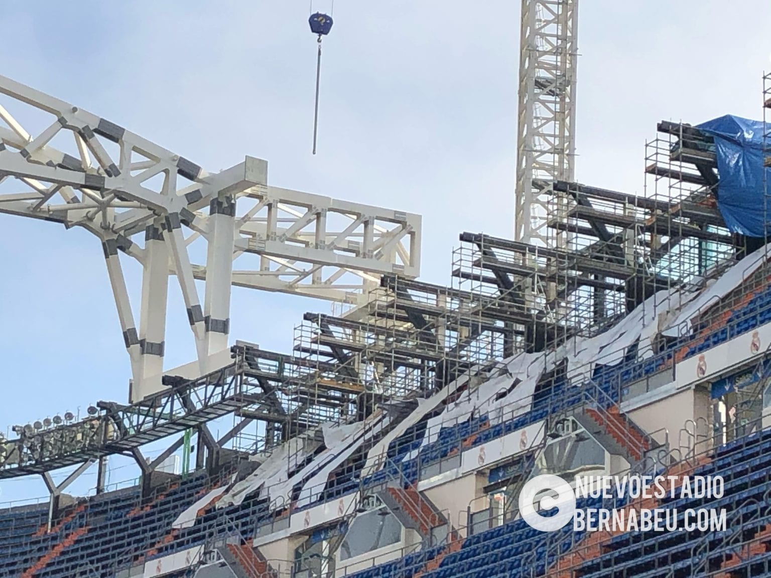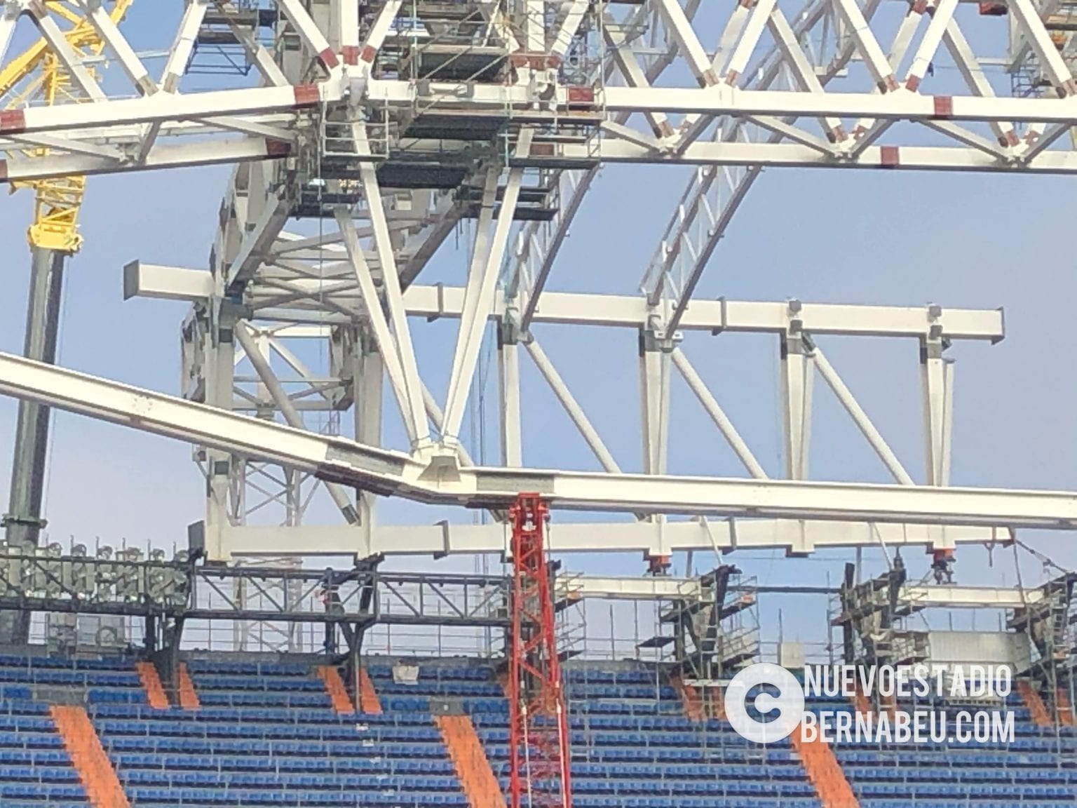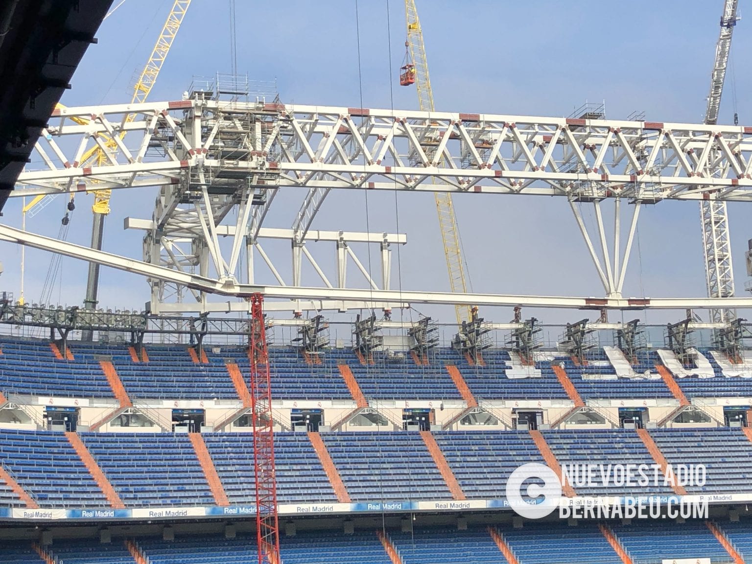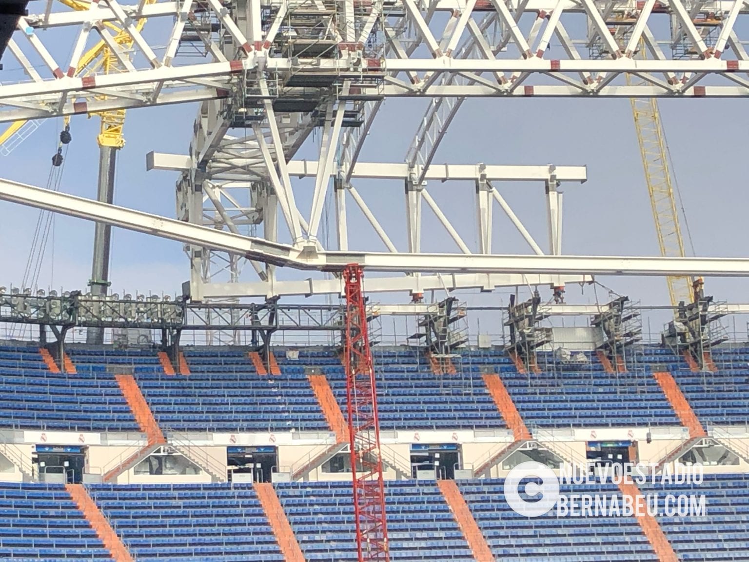 Se pueden ver los avances significativos en la cercha de fondo norte la cual se ensambla a velocidad de vértigo como si fuera un mecano “doméstico”. Las fotos no hacen justicia al tamaño de las piezas que se están apretando arriba, son realmente grandes y como se puede ver empieza a coger forma la estructura de la cubierta del fondo norte. Las sombras han vuelto a cubrir los asientos del Santiago Bernabéu.
