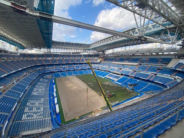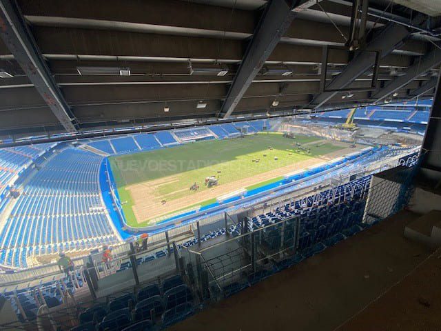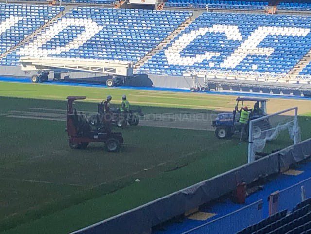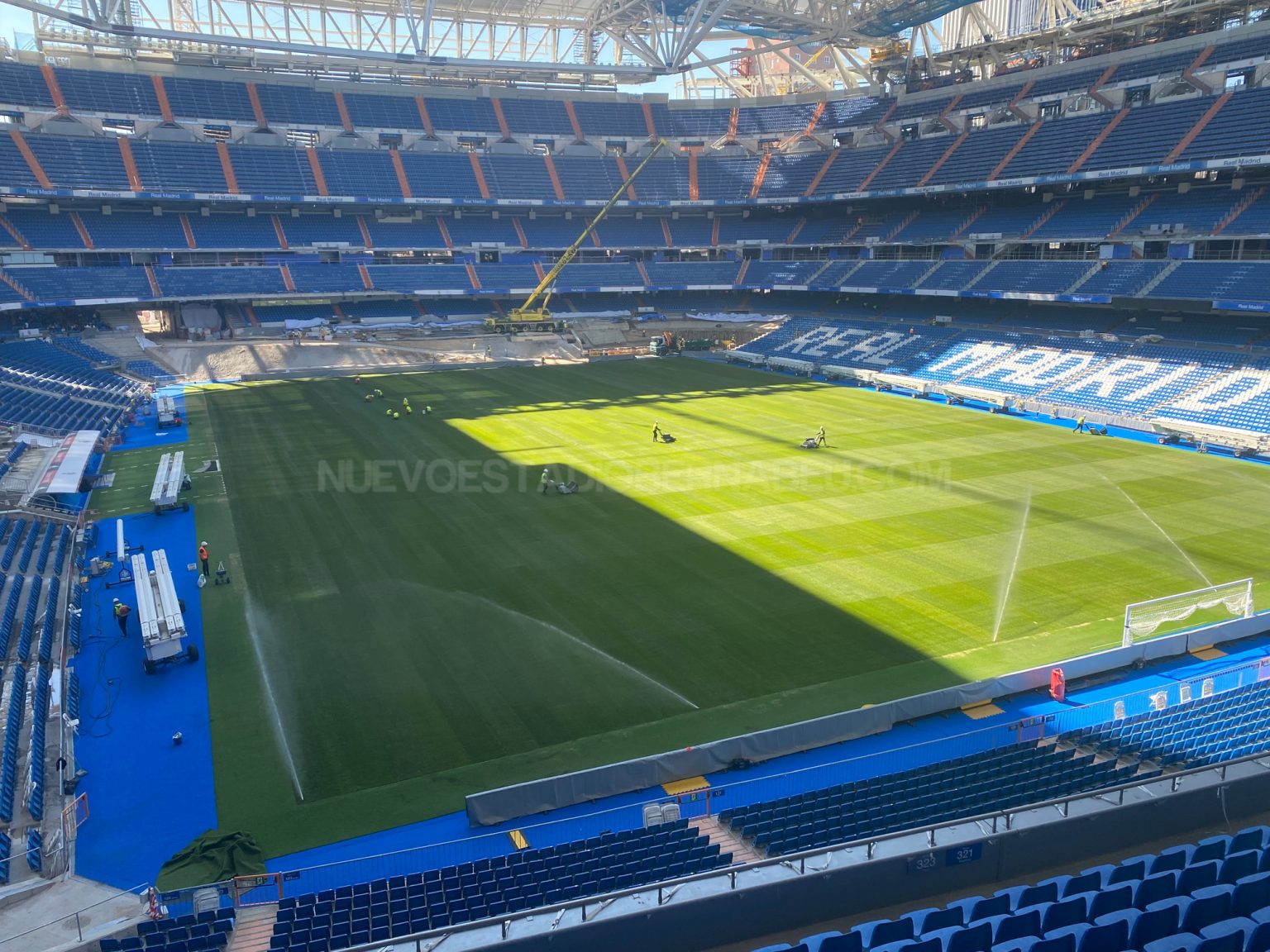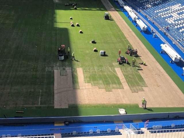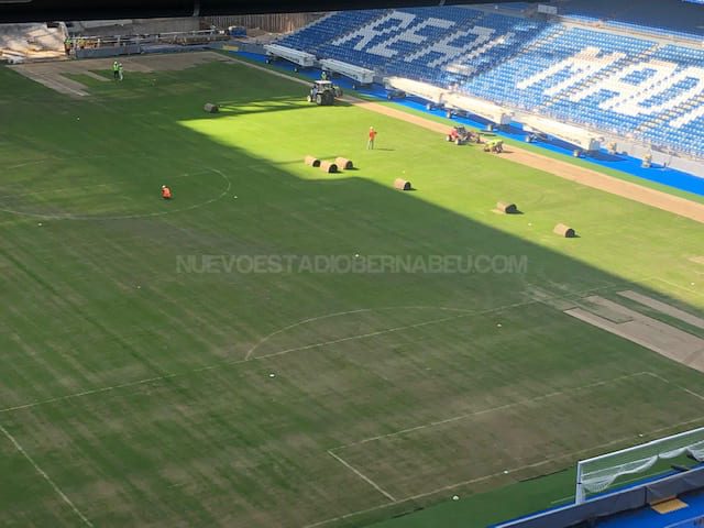 Parón de selecciones bien aprovechado en la remodelación del Santiago Bernabéu en que se ha cambiado el césped ante el mal estado que ha ofrecido en este comienzo de temporada y se ha colocado un nuevo césped sobre las bandejas del futuro terreno de juego mecanizado.