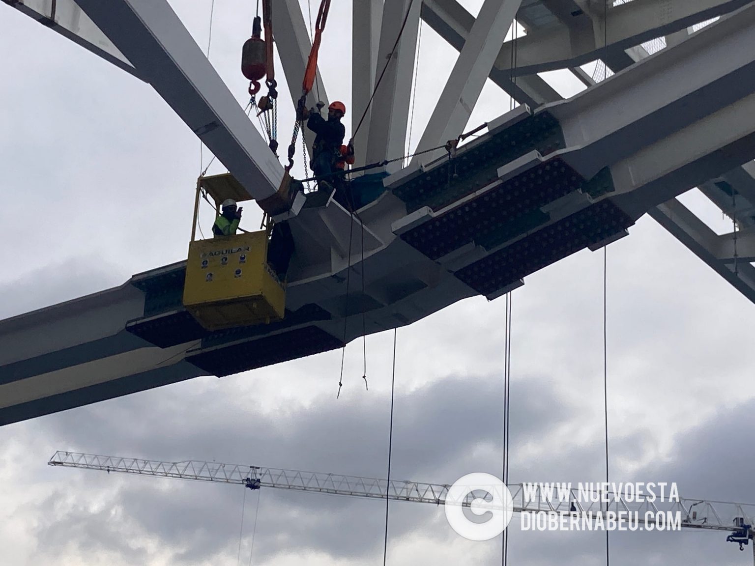 En cuanto a la cubierta todo está centrado en la viga corona que marcha a muy buen ritmo esperando que esté terminada para finales de año con el objetivo de descolgar la viga museo inmediatamente después. Durante estos días se va proceder al descuelgue, previo corte con soplete, de los contrapesos de los tensores de las cerchas atirantadas. Esta operación, necesaria, es un poco incómoda por los puntuales cortes de espacios públicos, pero se prevé hacer de manera rápida y con la menor afección posible.
