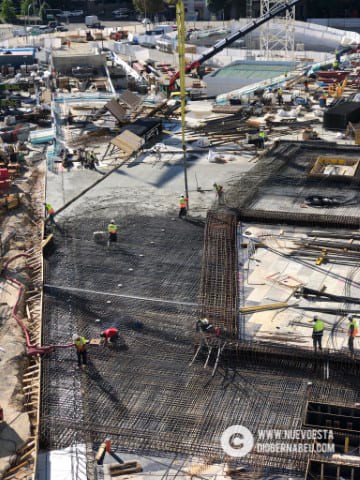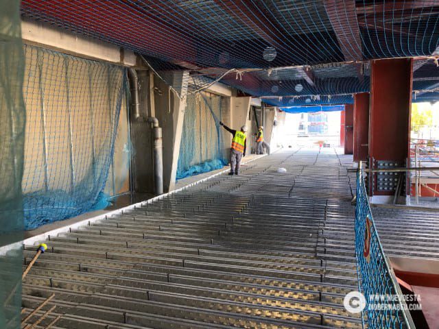 En la zona del terreno de juego se trabaja en las conexiones del túnel logístico y en el relleno y compactación de la zona del córner noroeste además del vaciado del box norte y su posterior entablado para formación de losa.