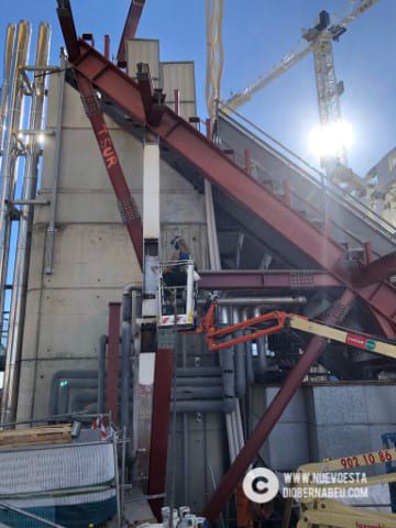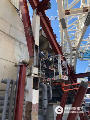 En cuanto al a cubierta se está arriostrando el conjunto de cubierta oeste a muchísima velocidad también y se ha comenzado a izar tramos de la viga corona, la cual circunscribirá todo el conjunto de cubierta en su perímetro superior exterior.