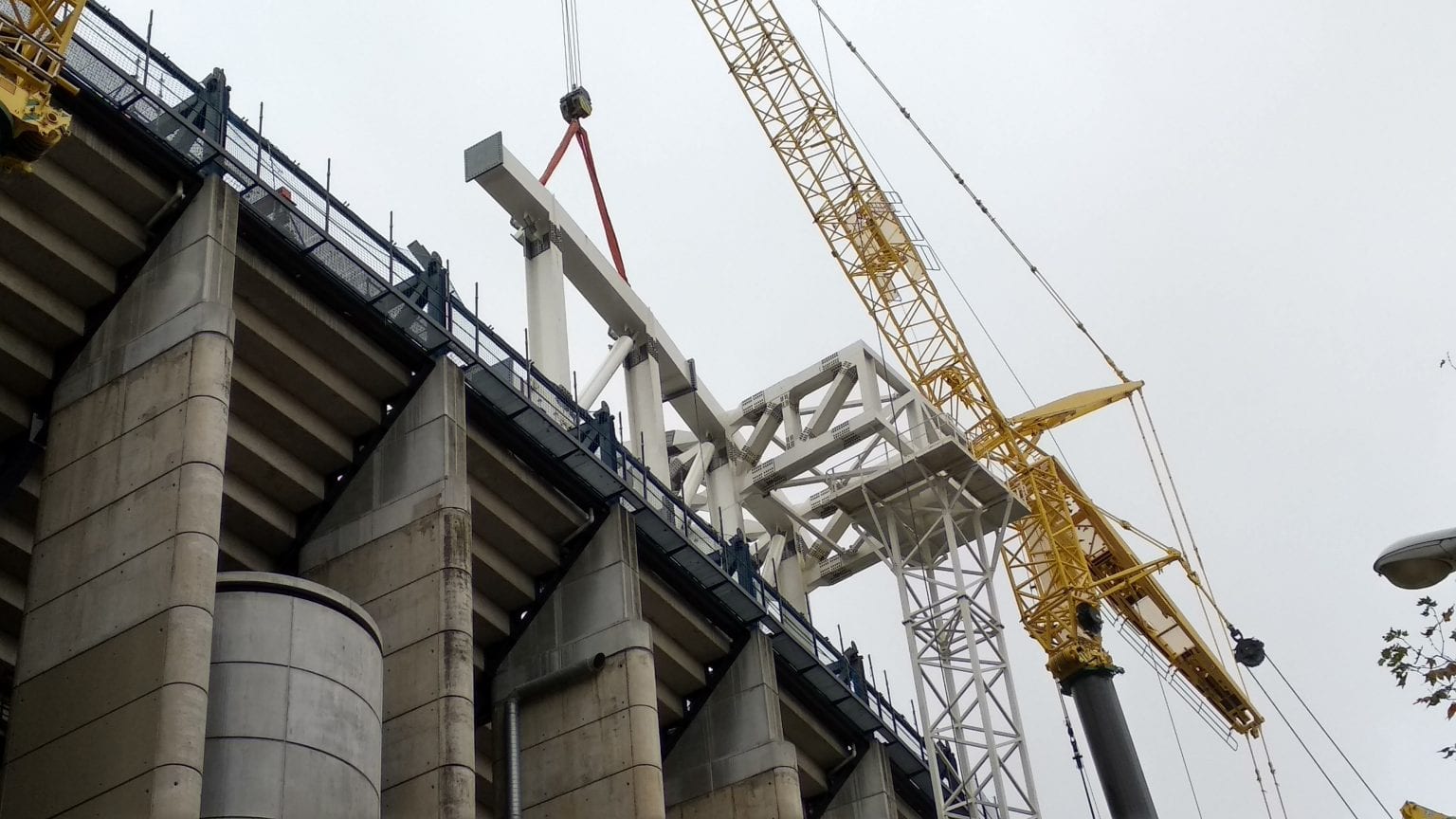 En esta semana como vimos en la actualización del jueves, se ha trabajado en el izado y acople de los primeros módulos de la cercha de fondo norte, a la que se unirán en los próximos días los módulos que han entrado en obra para su ensamblaje.