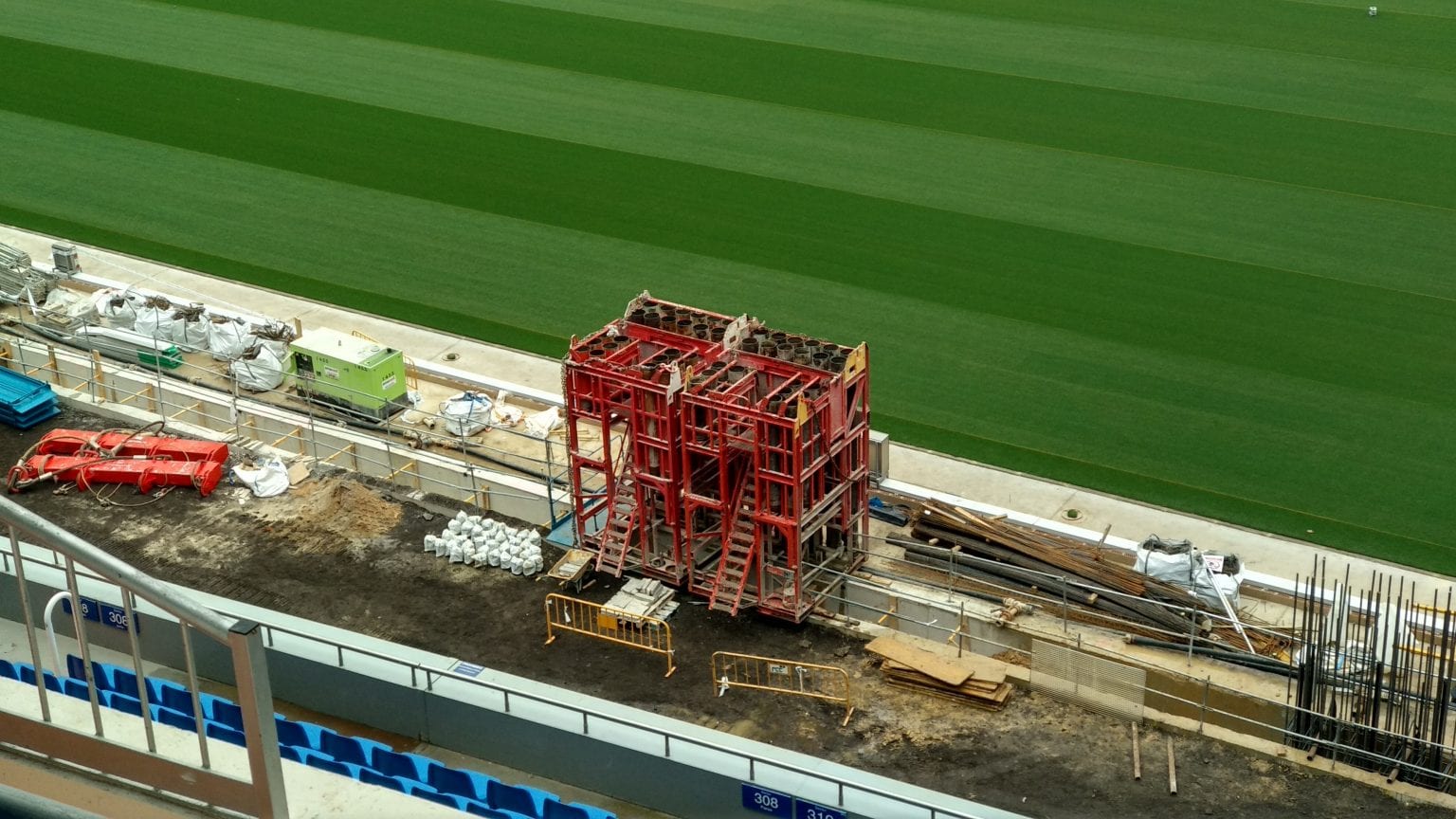 En el lateral oeste se han intensificado los trabajos de la pantalladora y especialmente los encofrados de la zona del córner noroeste y de la tribuna oeste. Además en el exterior del estadio se está terminado de hormigonar la plataforma auxiliar, que ya cuenta con las barandillas de seguridad, enganches, y demás medios necesarios para el ensamblaje de las cerchas longitudinales que se van a empezar a ensamblar desde ya mismo.