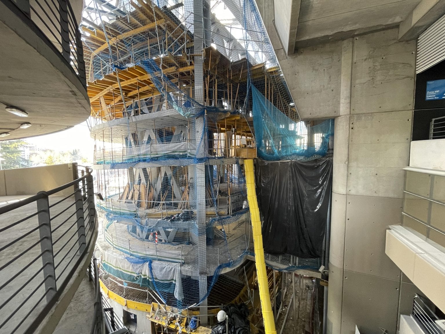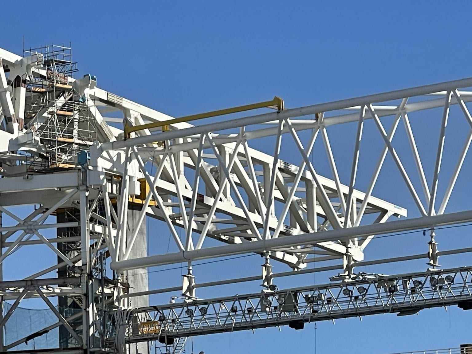 Con respecto a la nueva cubierta el avance de la nueva cubierta norte es sustancial. Quedan por izar y acoplar los módulos 4 y 5 en sus formas tubulares y a partir de ahí esta misma semana comienzan las labores de “limpieza” de la cercha con la retirada de andamios, escaleras y del PEMP noreste. En la nueva cubierta sur se ha preparado todo para empezar a izar módulos, si todo marcha bien los módulos 6 y 7 quedarán acoplados esta semana.