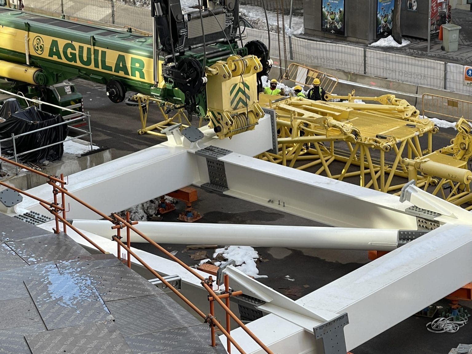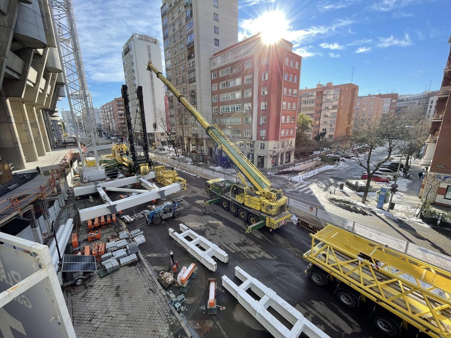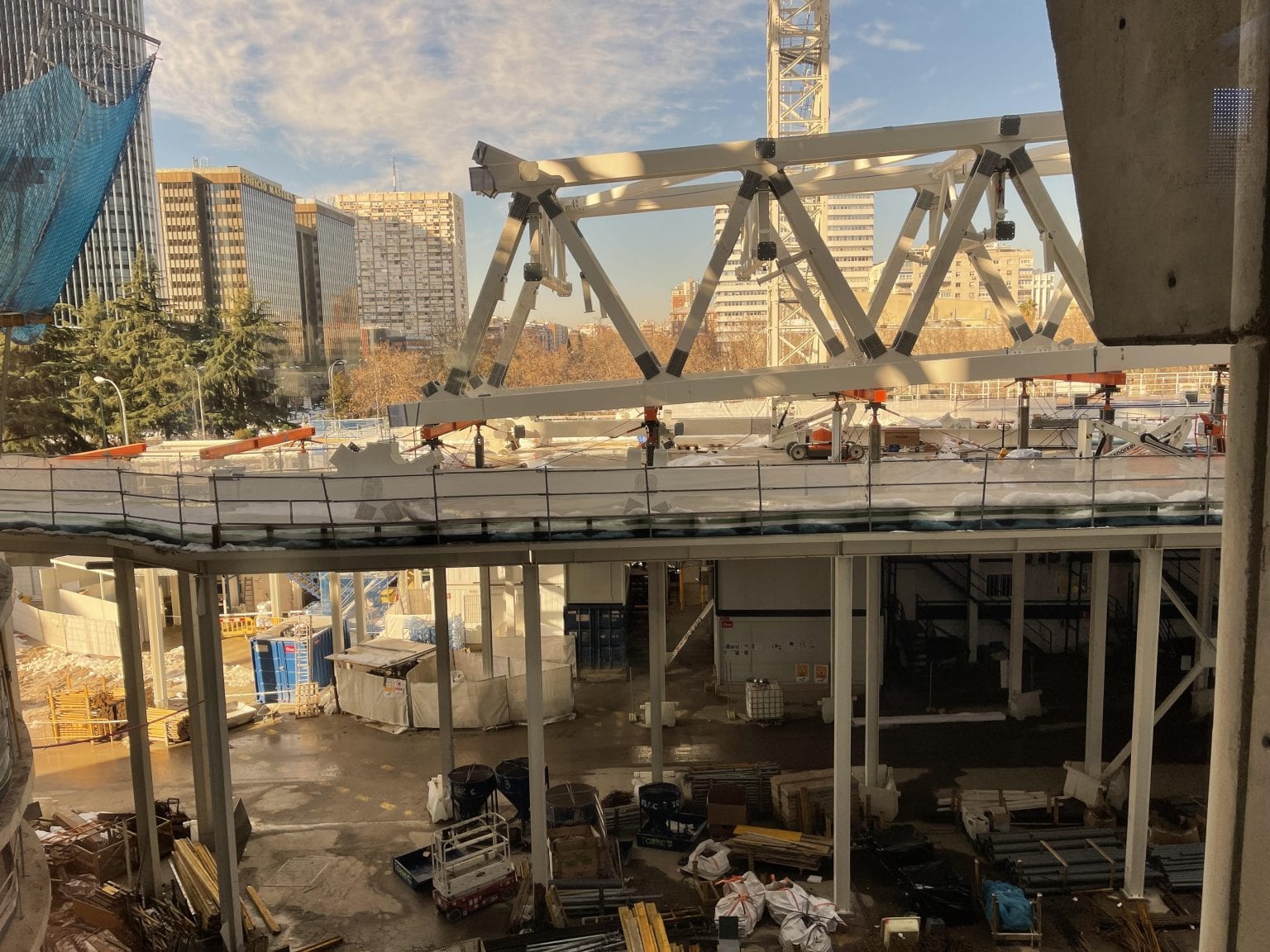 En el campamento de obra de Castellana, sobre la estructura auxiliar, sigue creciendo la primera de las cerchas longitudinales norte-sur que se izará en las próximas semanas.