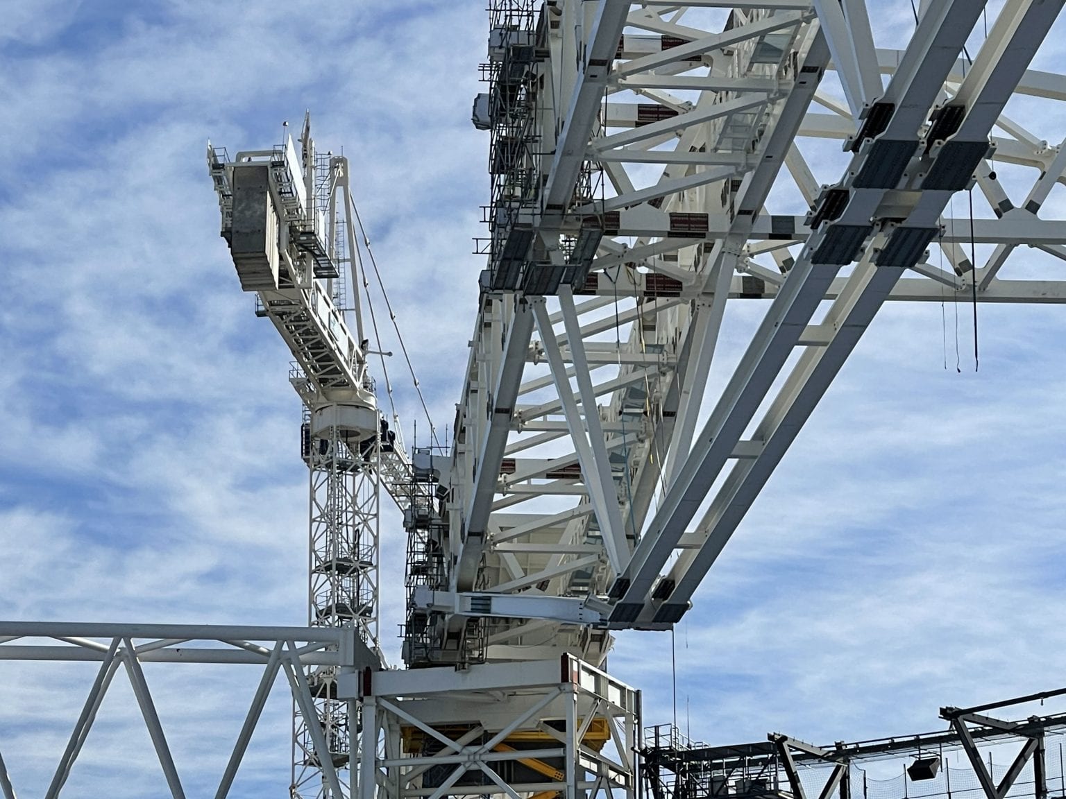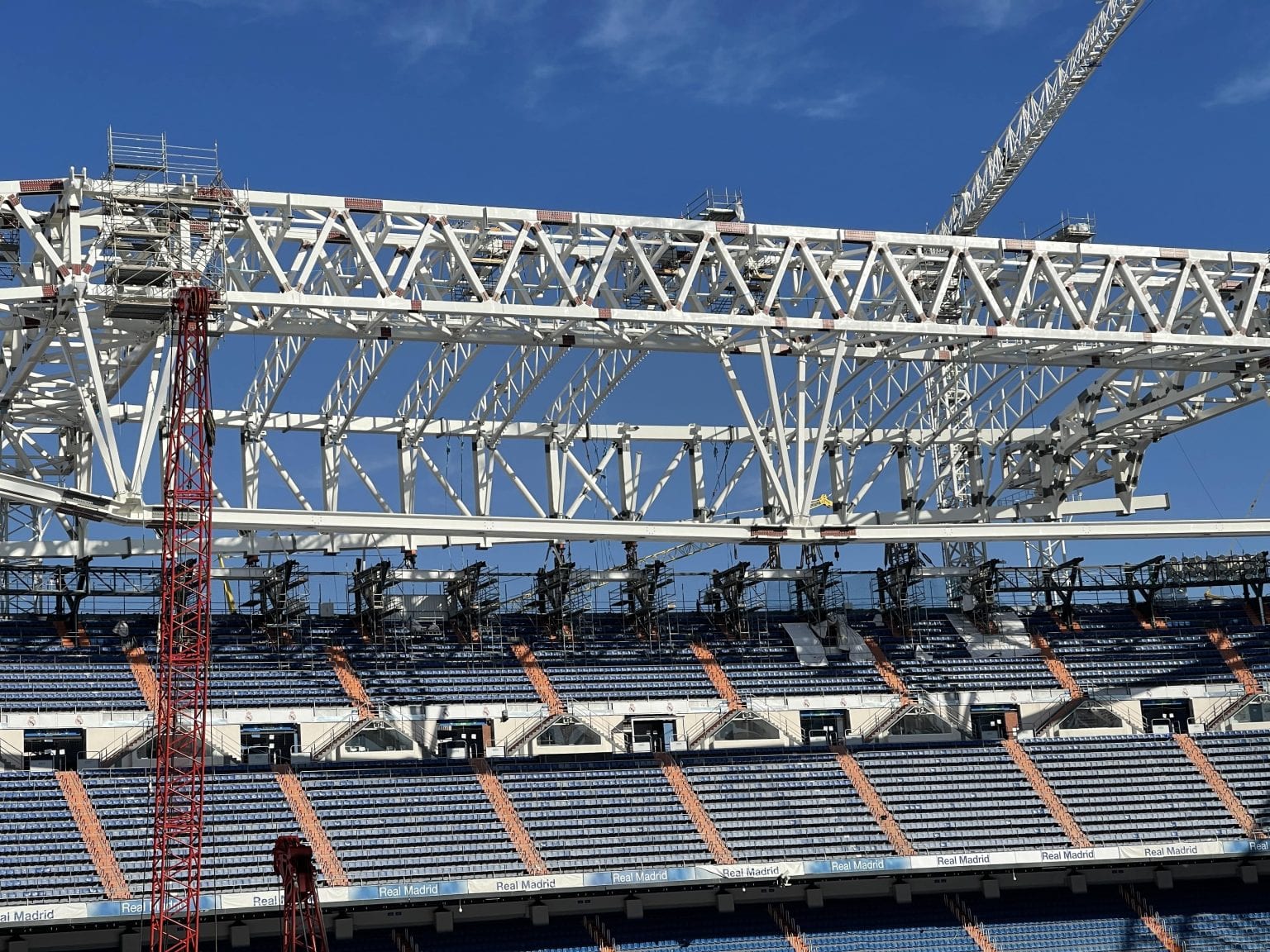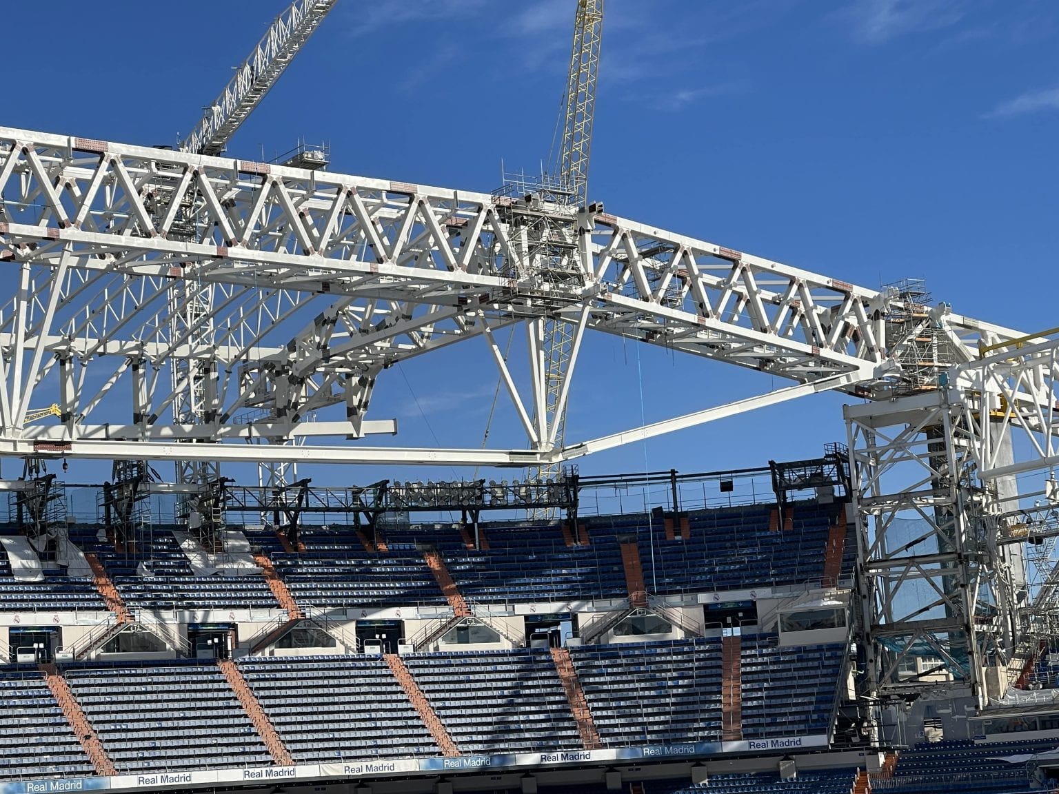 En el campamento de obra de Castellana, sobre la estructura auxiliar, sigue creciendo la primera de las cerchas longitudinales norte-sur que se izará en las próximas semanas.