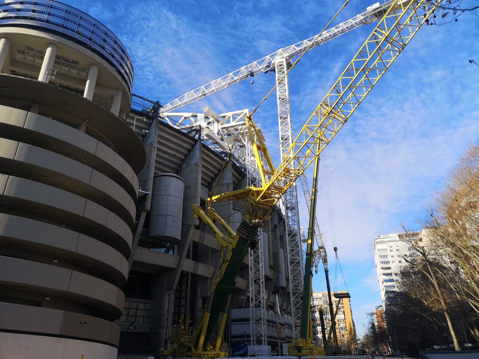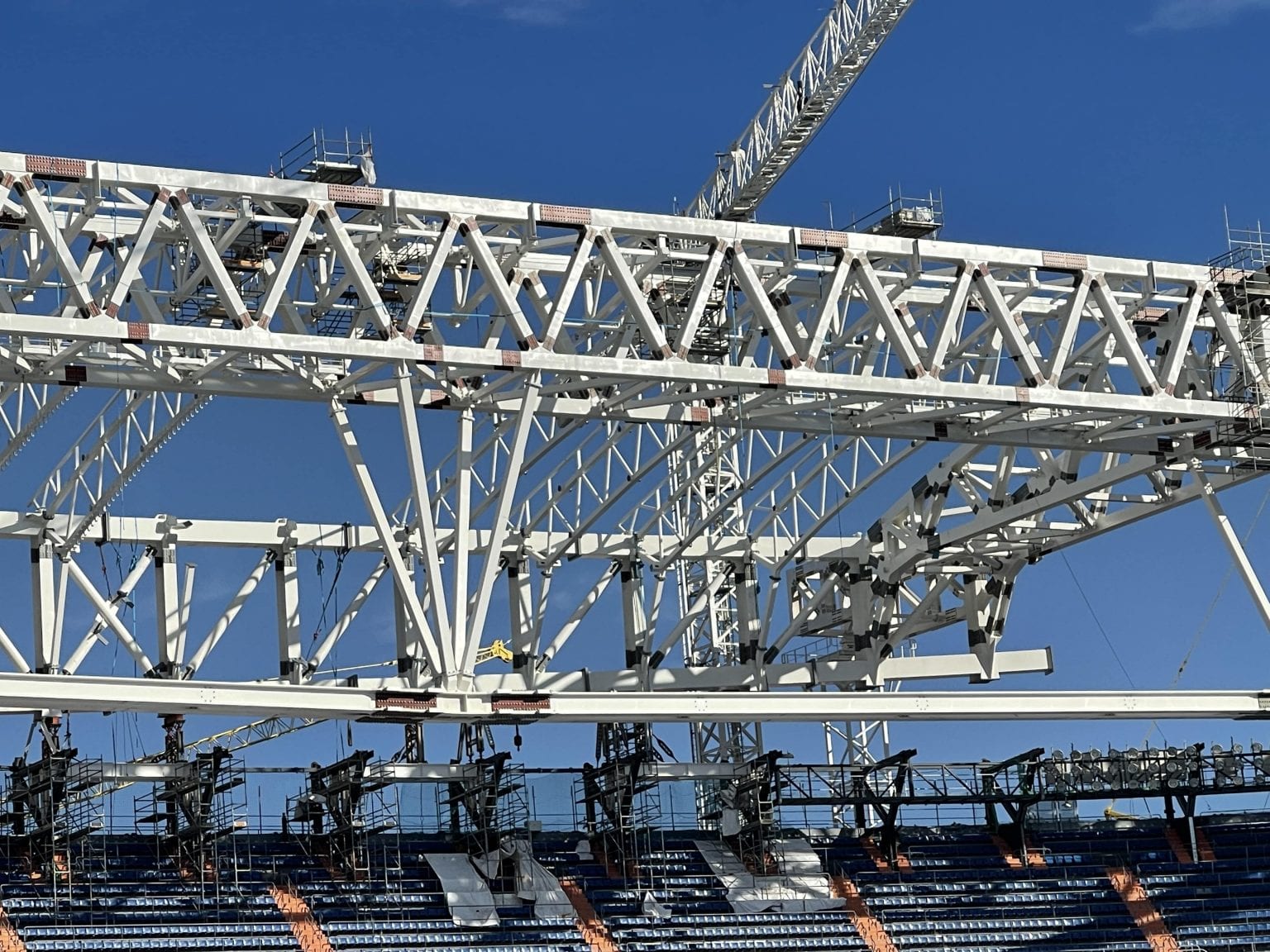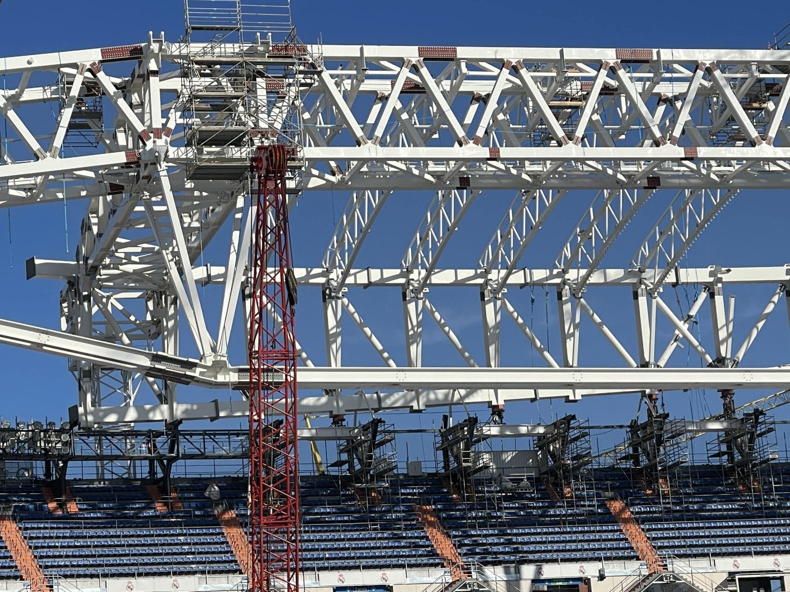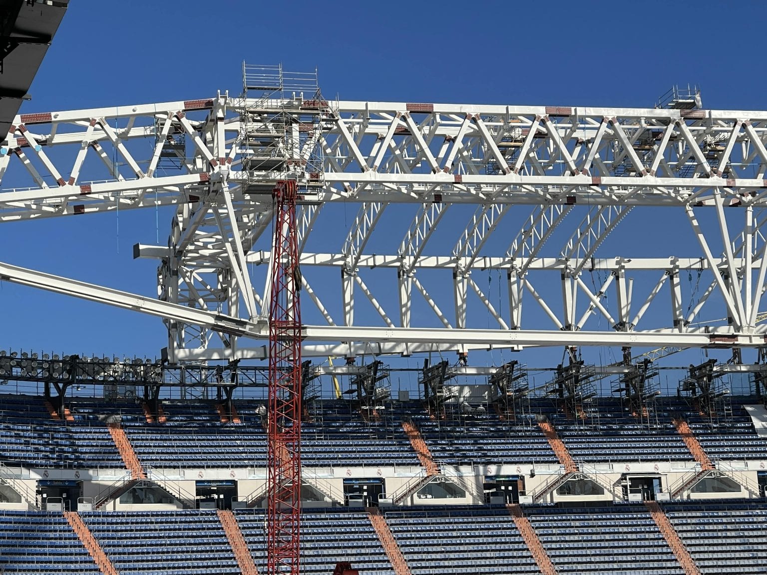 En el lateral este se ha acoplado sobre la zona D la estructura auxiliar para la traslación de la viga existente en dicho lateral y hoy lunes comienza a instalarse la análoga sobre la zona A. Estas estructuras posibilitarán el retraso, desmontaje y posterior bajada de la viga-cercha que actualmente está dando servicios de iluminación, video vigilancia, wifi y sonido en tanto en cuanto la nueva estructura de cubierta del lateral este no esté preparada.