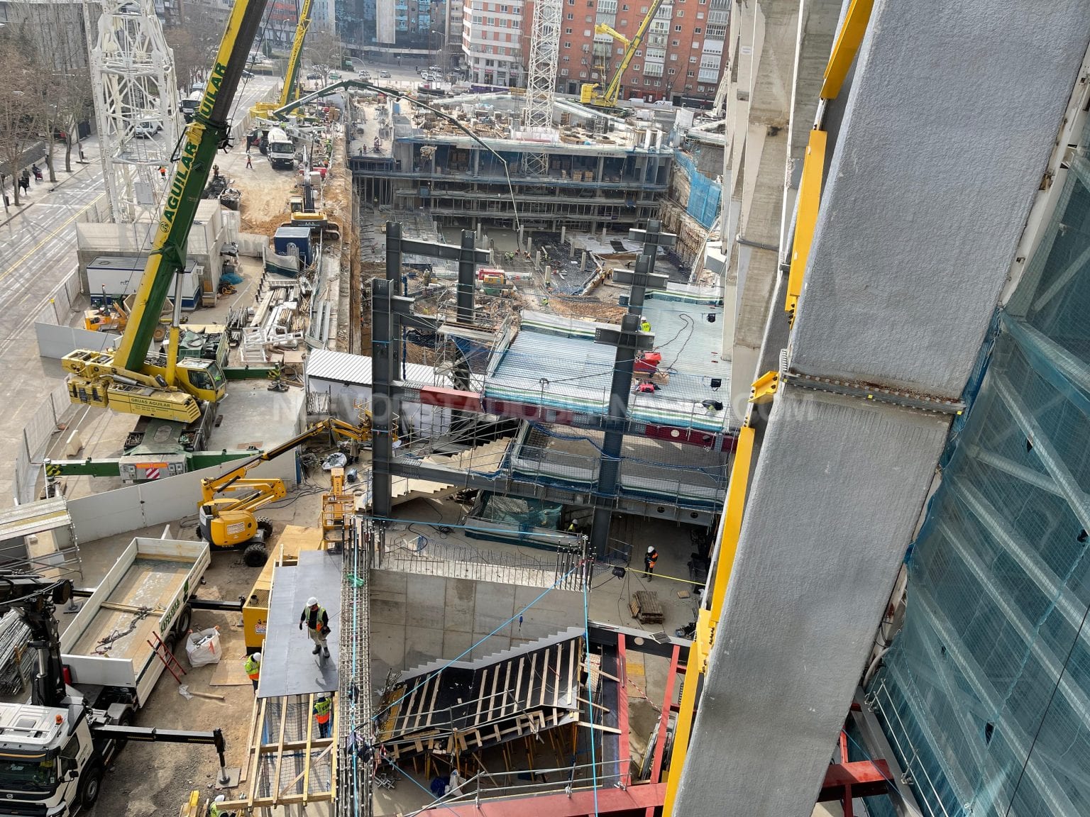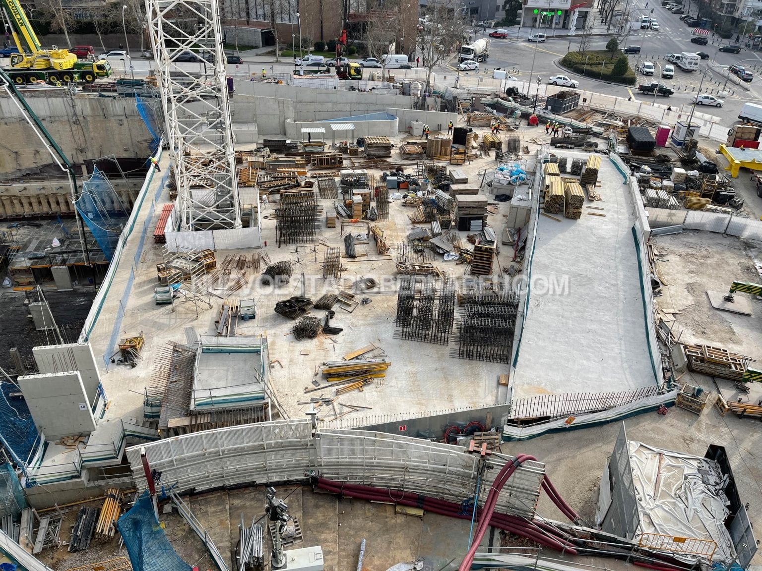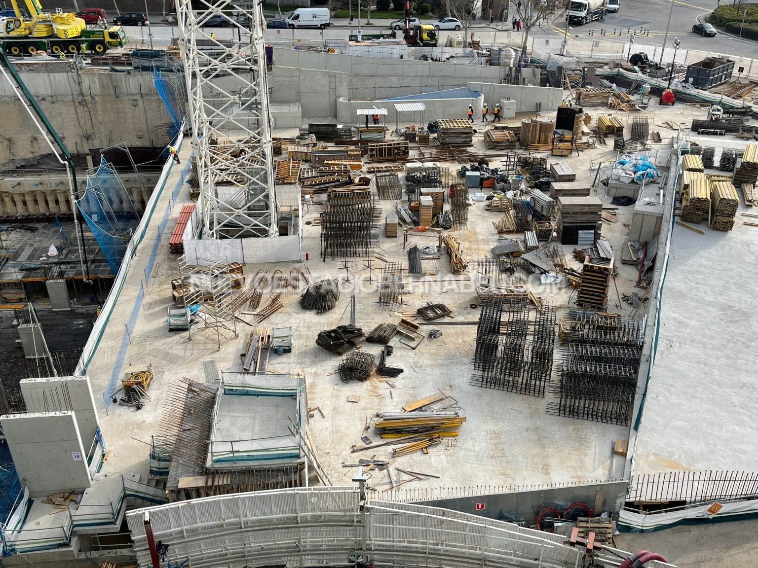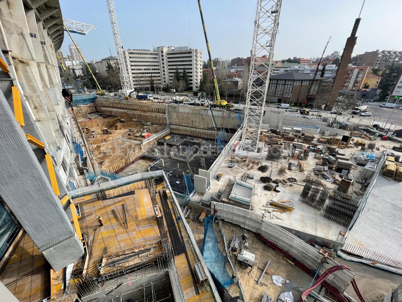 El nuevo parking continúa en un avance largo, complejo y tedioso. La fase I está en un nivel óptimo de terminación pero la fase II y III tienen aún muchas horas de trabajo hasta que veamos cumplido el bloque completo de más de 90 metros de altura desde arranque bajo rasante que formará el conjunto de sótanos más el nuevo edificio este. No es poca cosa, y esta es otra de las actuaciones vitales para el nuevo Bernabéu aunque llegados a este punto de obra todo es vital, todo hace de cuello de botella para la actuación siguiente y así pasan las semanas con una coordinación absoluta en la ejecución de trabajos.