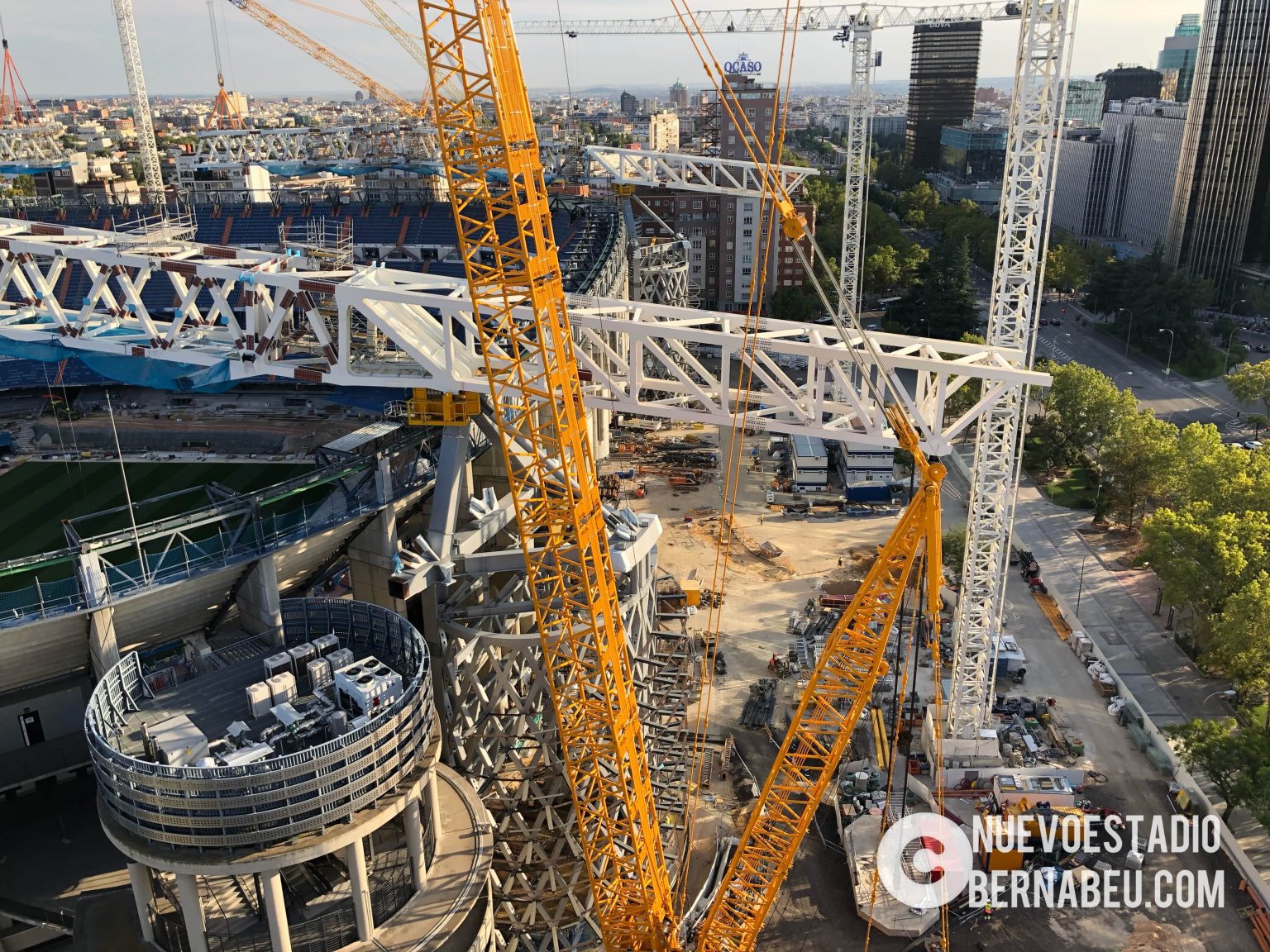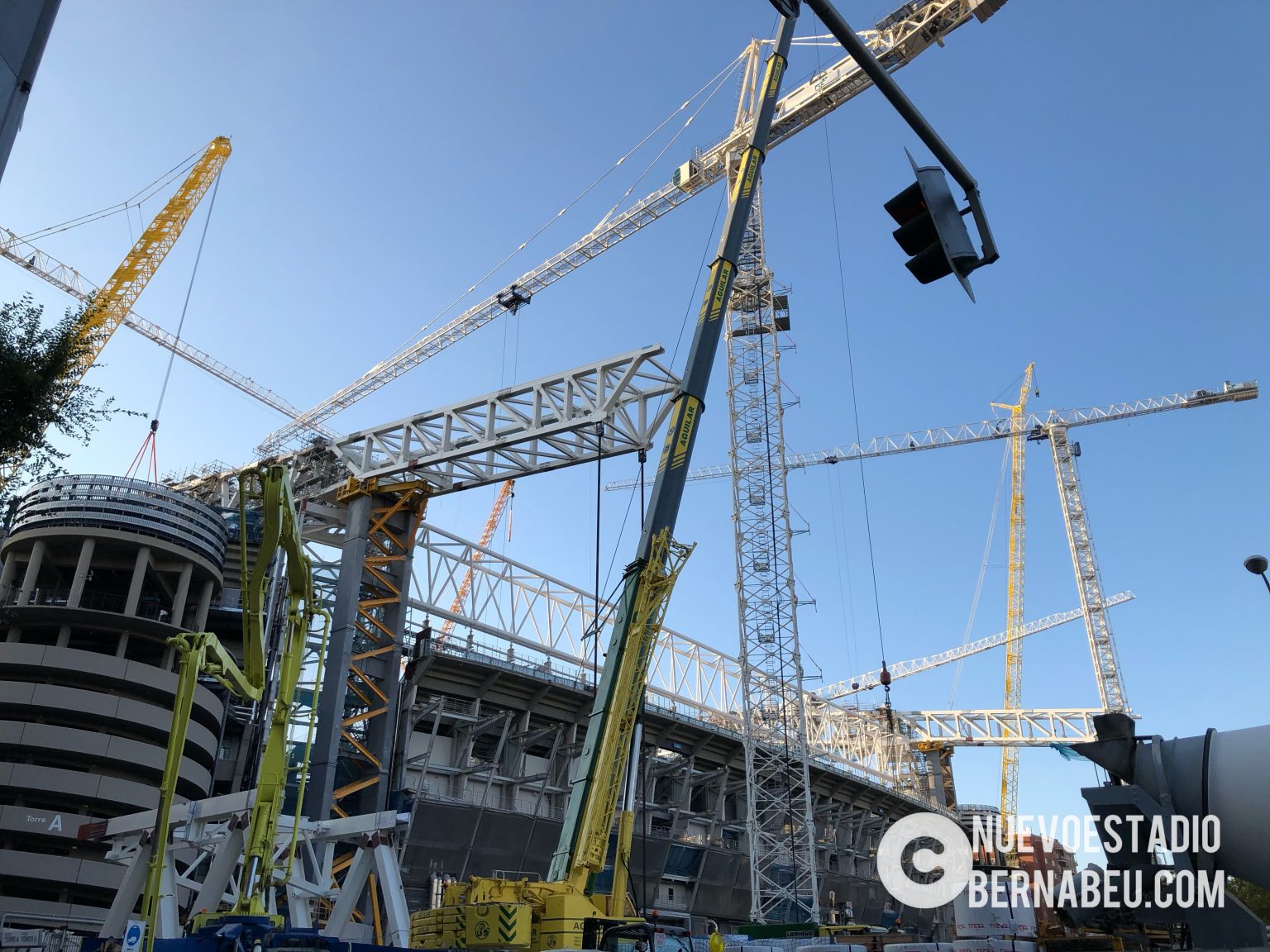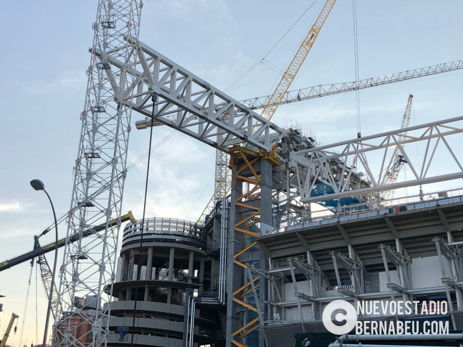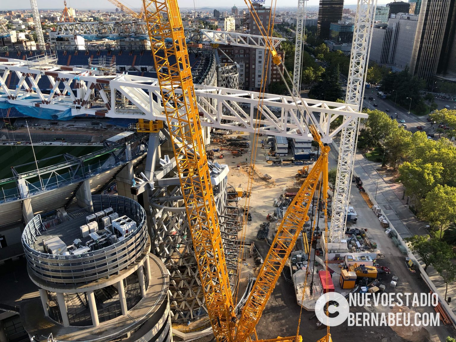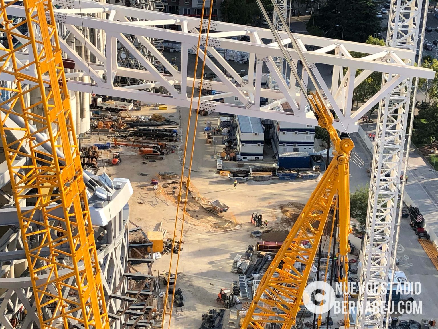 Espectacular! la radiografía de la magnitud de la obra en estos momentos admite todo tipo de calificativos «grandes». Con la cercha norte en fase de cierre y la cercha sur avanzando a un ritmo vertiginoso durante los últimos días, os traemos unas fotos realmente espectaculares en tomas altas desde los fondos norte y sur en las que podéis apreciar los detalles de los trabajos en voladizo y de la actividad, tanto en la campa de obra del paseo de la Castellana, como del lateral este en el que se está desmontando la fachada. Se han quitado las mallas que fachada que se instalaron en 2002 y ahora mismo se esta cortando y desmontando toda la estructura de agarrre de esa malla.