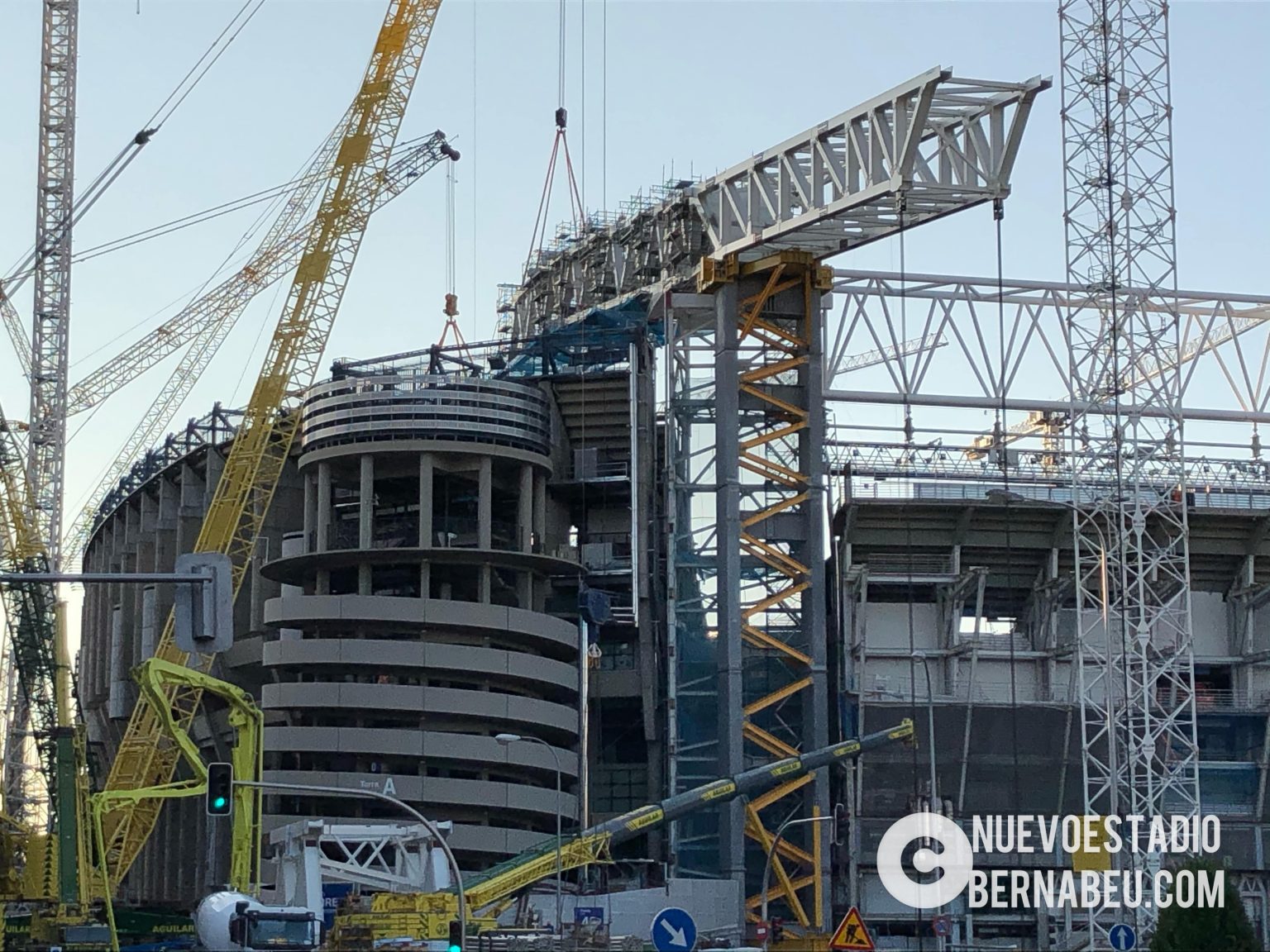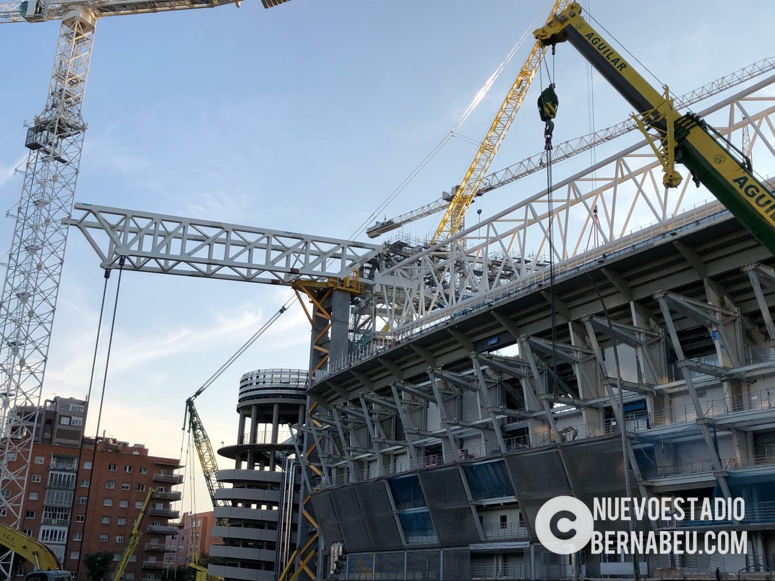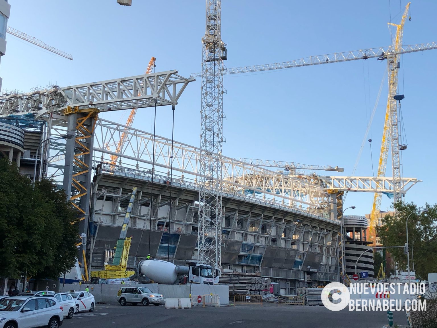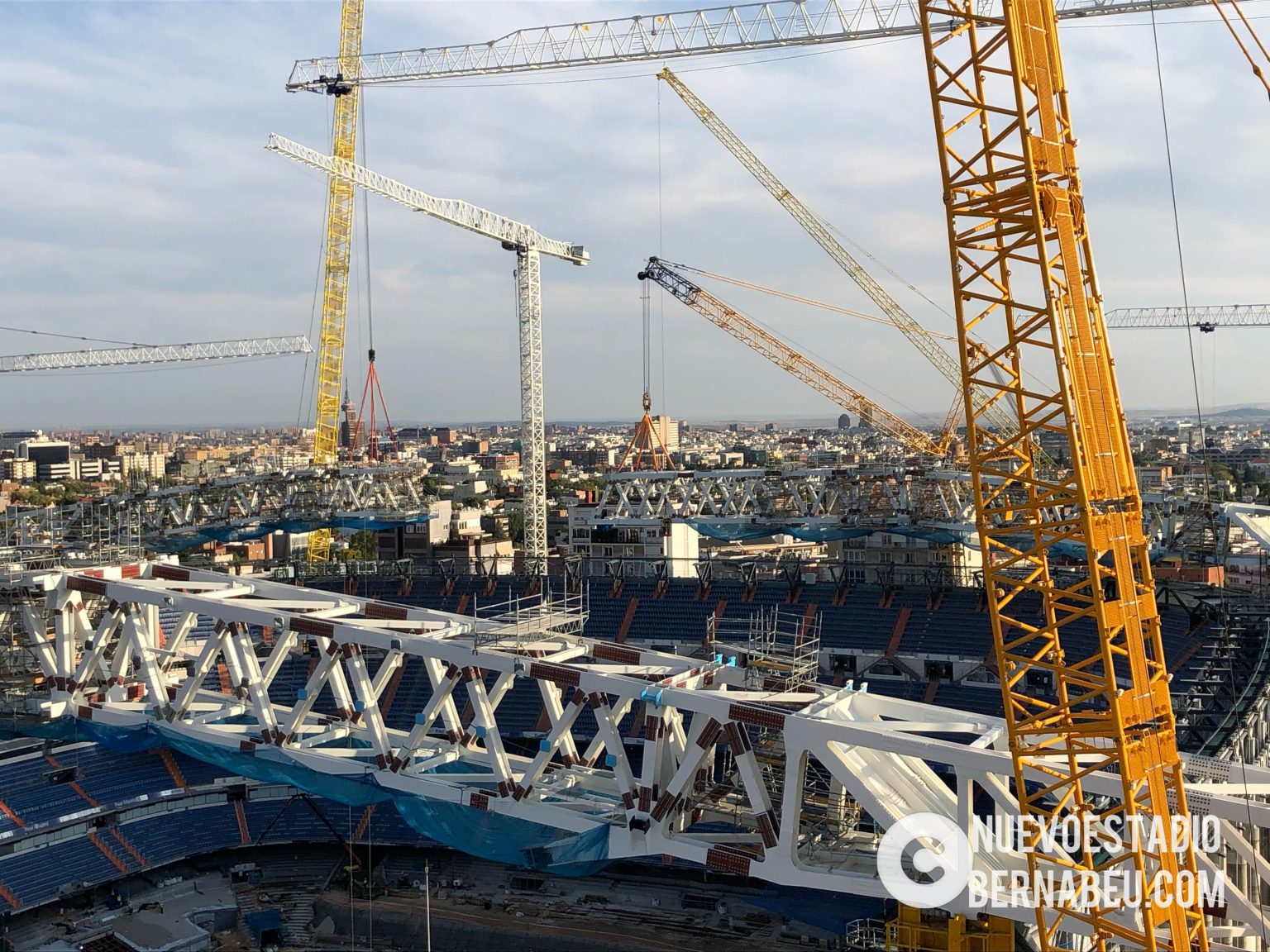 Espectacular! la radiografía de la magnitud de la obra en estos momentos admite todo tipo de calificativos «grandes». Con la cercha norte en fase de cierre y la cercha sur avanzando a un ritmo vertiginoso durante los últimos días, os traemos unas fotos realmente espectaculares en tomas altas desde los fondos norte y sur en las que podéis apreciar los detalles de los trabajos en voladizo y de la actividad, tanto en la campa de obra del paseo de la Castellana, como del lateral este en el que se está desmontando la fachada. Se han quitado las mallas que fachada que se instalaron en 2002 y ahora mismo se esta cortando y desmontando toda la estructura de agarrre de esa malla.