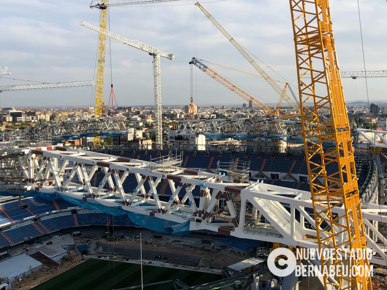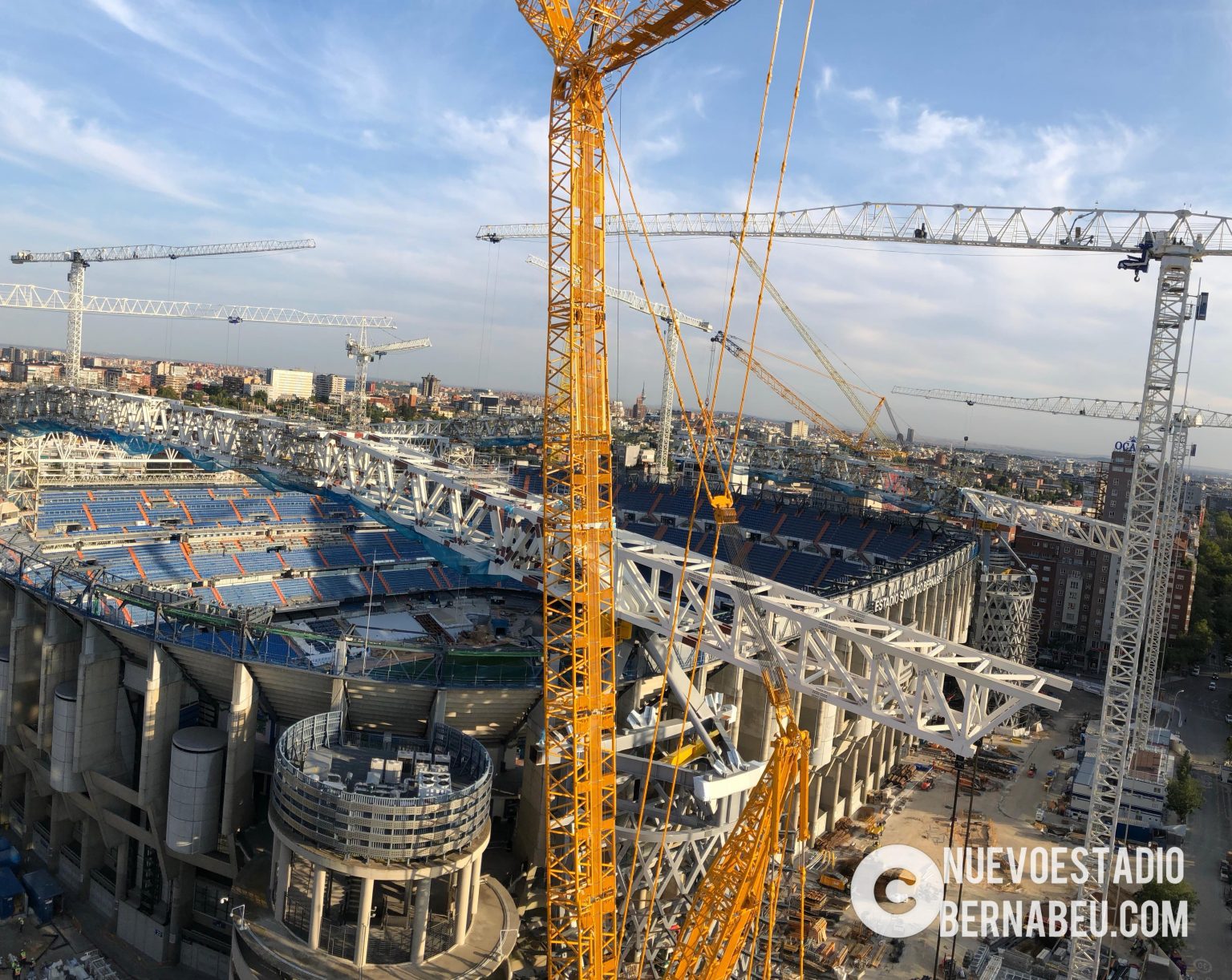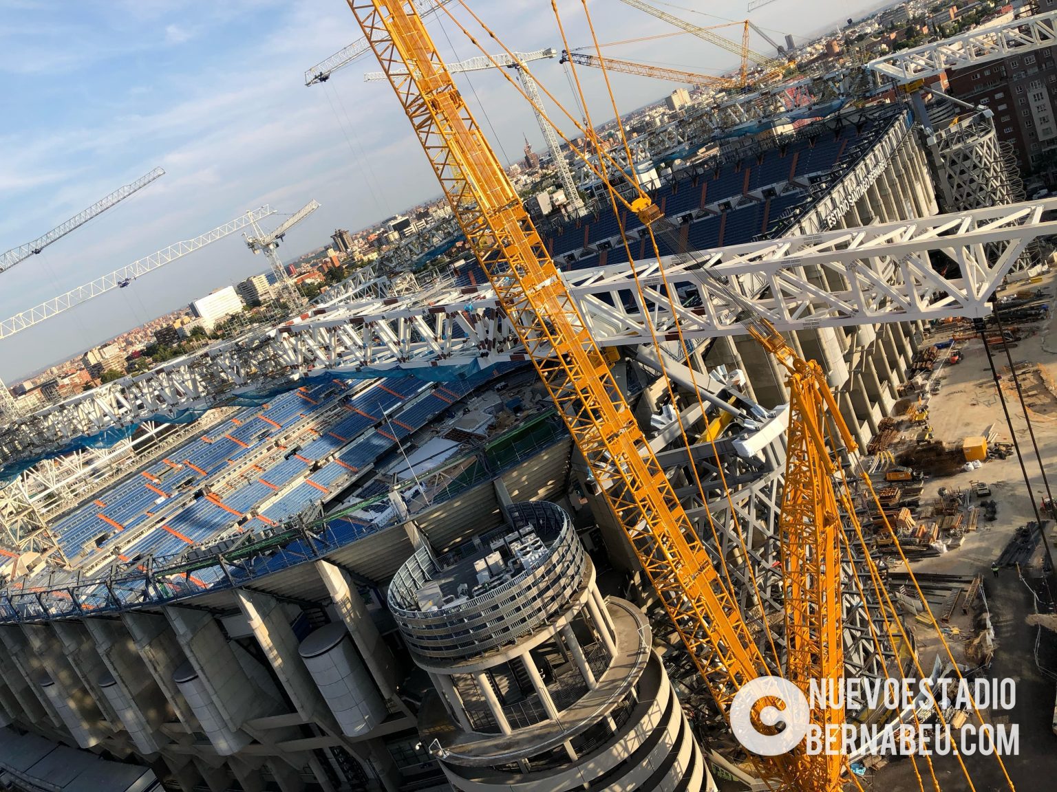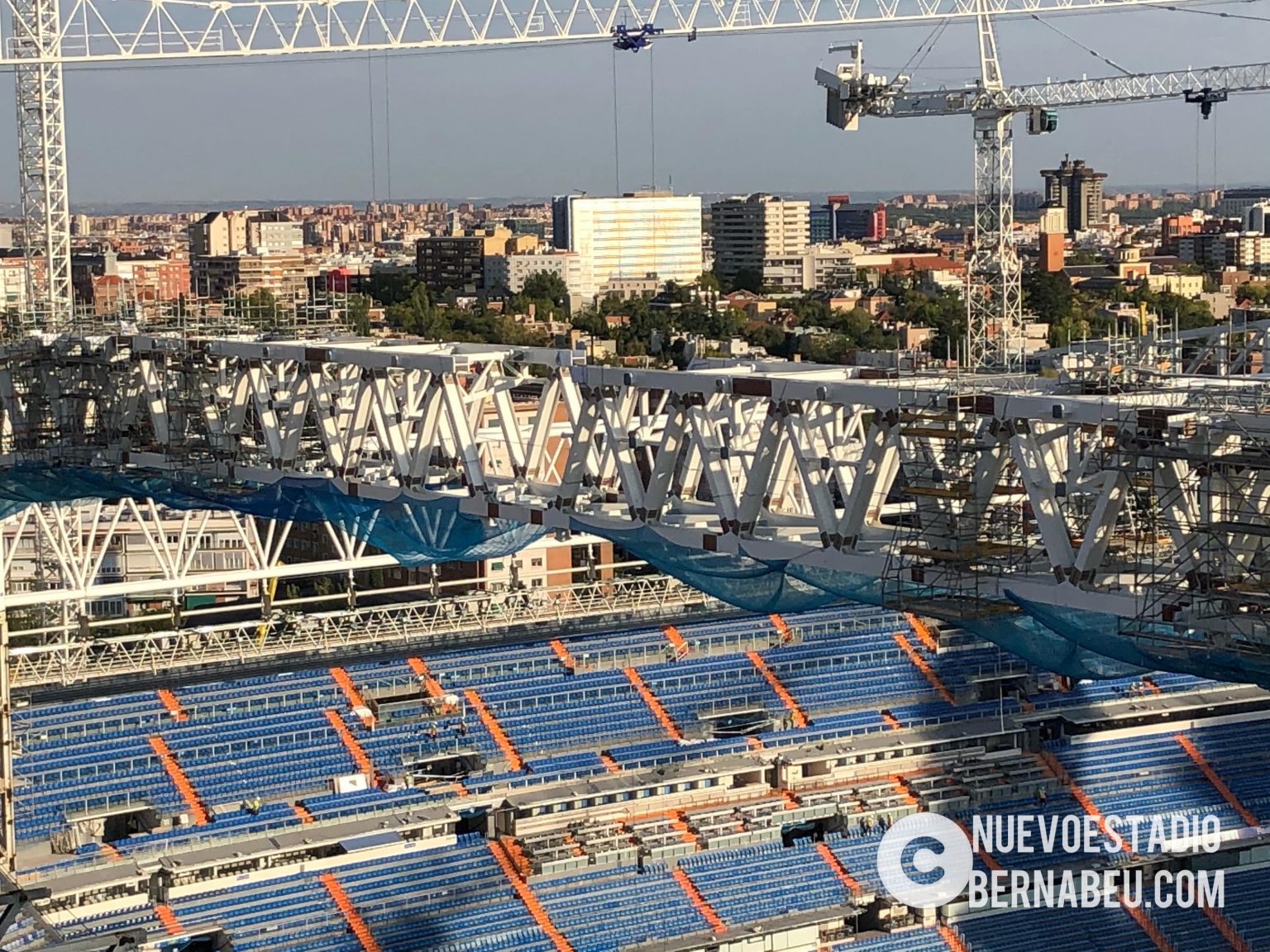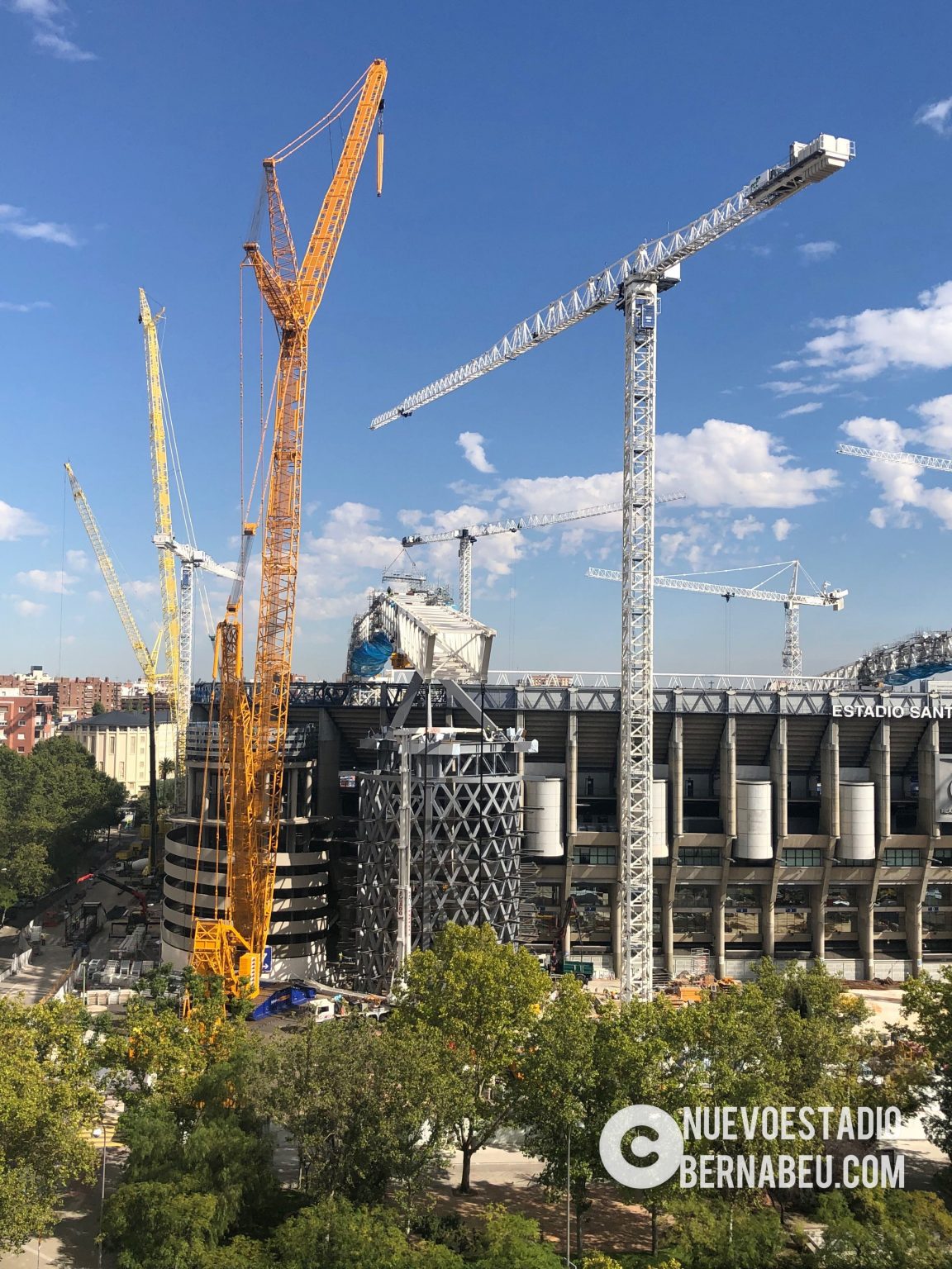 Espectacular! la radiografía de la magnitud de la obra en estos momentos admite todo tipo de calificativos «grandes». Con la cercha norte en fase de cierre y la cercha sur avanzando a un ritmo vertiginoso durante los últimos días, os traemos unas fotos realmente espectaculares en tomas altas desde los fondos norte y sur en las que podéis apreciar los detalles de los trabajos en voladizo y de la actividad, tanto en la campa de obra del paseo de la Castellana, como del lateral este en el que se está desmontando la fachada. Se han quitado las mallas que fachada que se instalaron en 2002 y ahora mismo se esta cortando y desmontando toda la estructura de agarrre de esa malla.