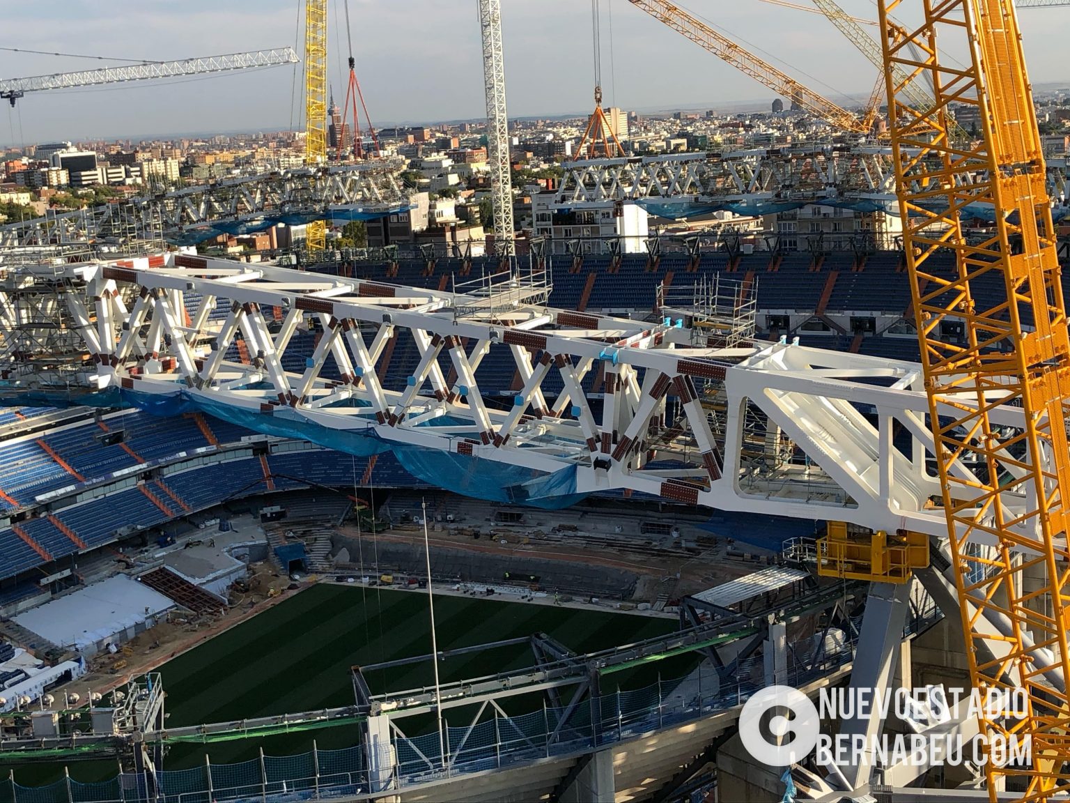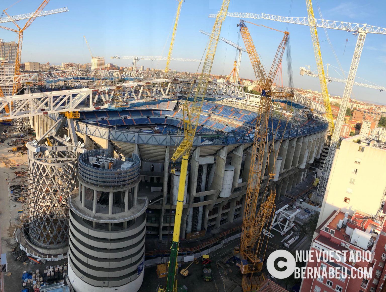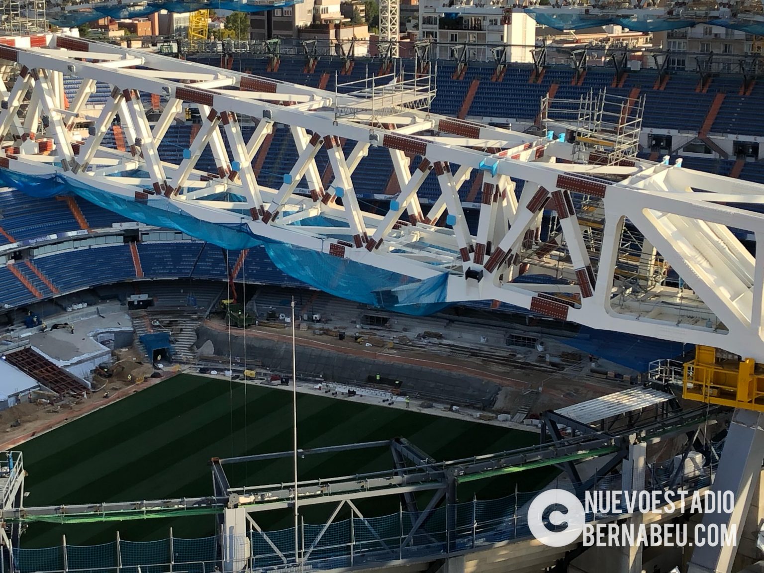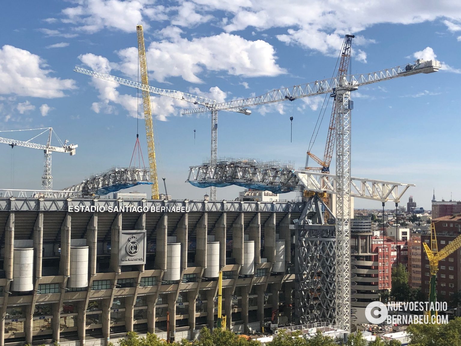 Espectacular! la radiografía de la magnitud de la obra en estos momentos admite todo tipo de calificativos «grandes». Con la cercha norte en fase de cierre y la cercha sur avanzando a un ritmo vertiginoso durante los últimos días, os traemos unas fotos realmente espectaculares en tomas altas desde los fondos norte y sur en las que podéis apreciar los detalles de los trabajos en voladizo y de la actividad, tanto en la campa de obra del paseo de la Castellana, como del lateral este en el que se está desmontando la fachada. Se han quitado las mallas que fachada que se instalaron en 2002 y ahora mismo se esta cortando y desmontando toda la estructura de agarrre de esa malla.