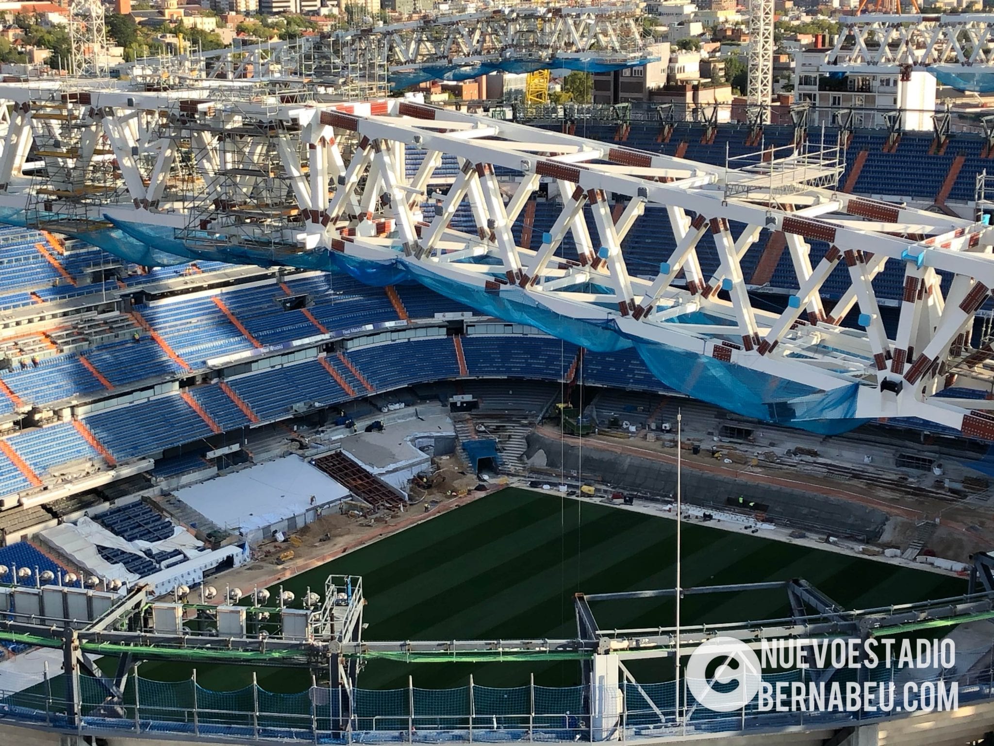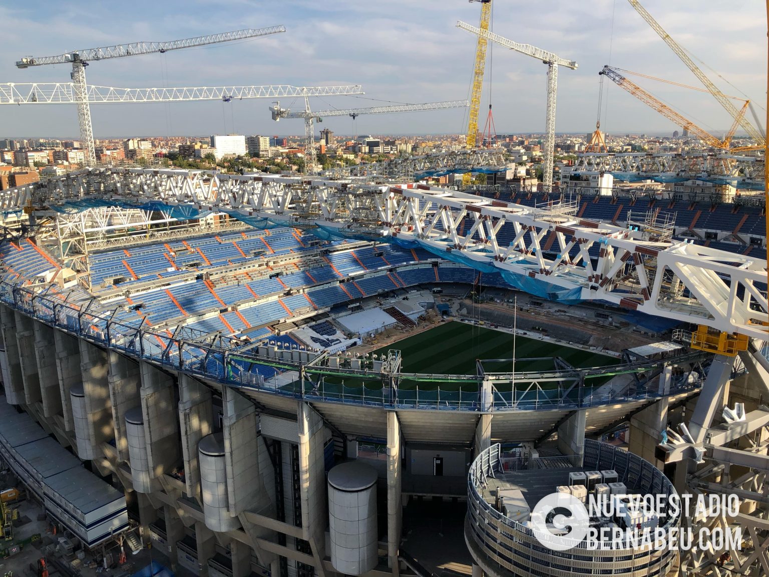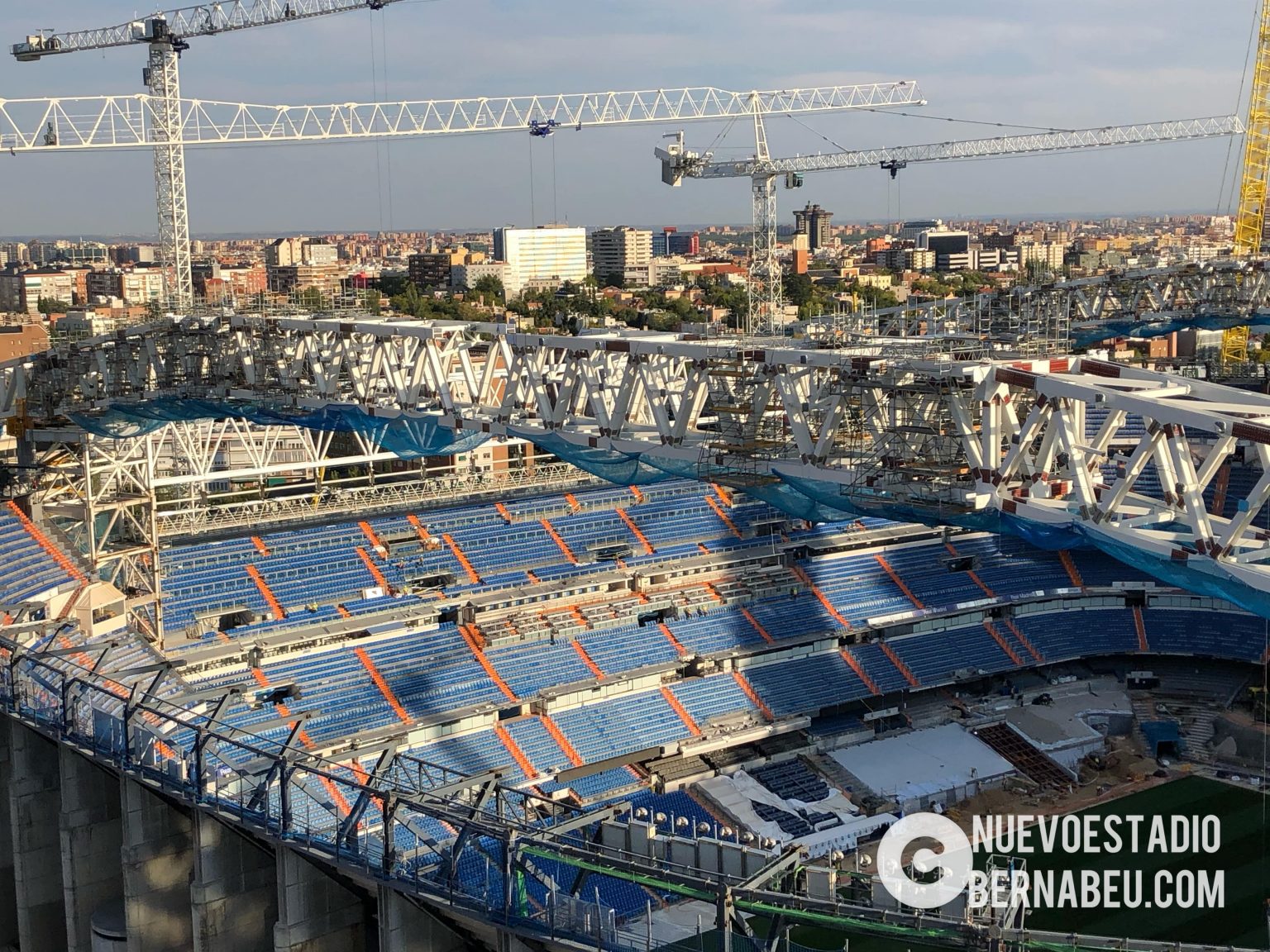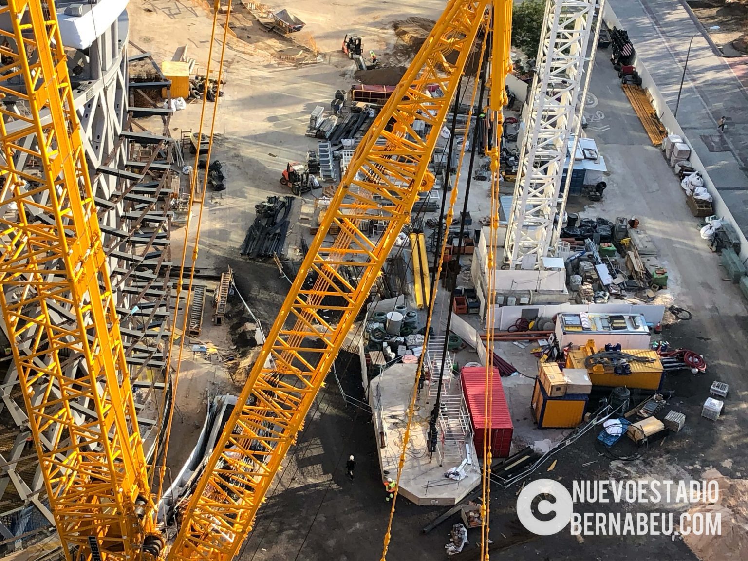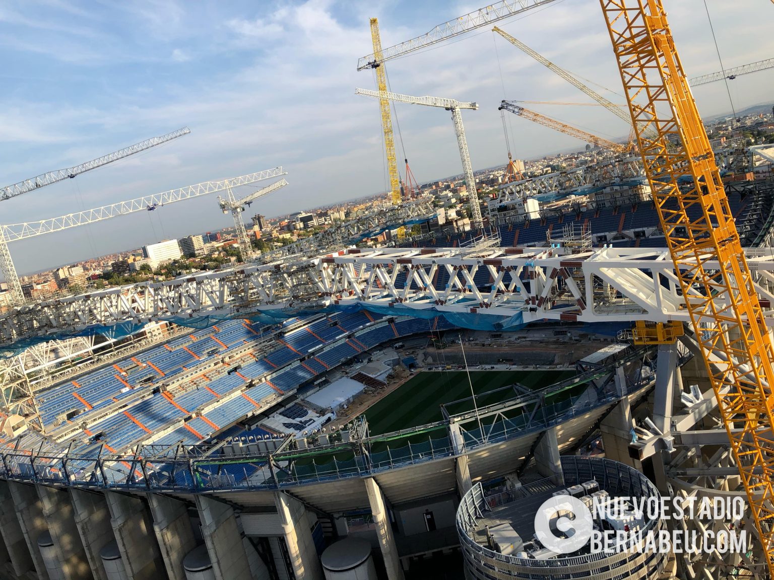 Espectacular! la radiografía de la magnitud de la obra en estos momentos admite todo tipo de calificativos «grandes». Con la cercha norte en fase de cierre y la cercha sur avanzando a un ritmo vertiginoso durante los últimos días, os traemos unas fotos realmente espectaculares en tomas altas desde los fondos norte y sur en las que podéis apreciar los detalles de los trabajos en voladizo y de la actividad, tanto en la campa de obra del paseo de la Castellana, como del lateral este en el que se está desmontando la fachada. Se han quitado las mallas que fachada que se instalaron en 2002 y ahora mismo se esta cortando y desmontando toda la estructura de agarrre de esa malla.