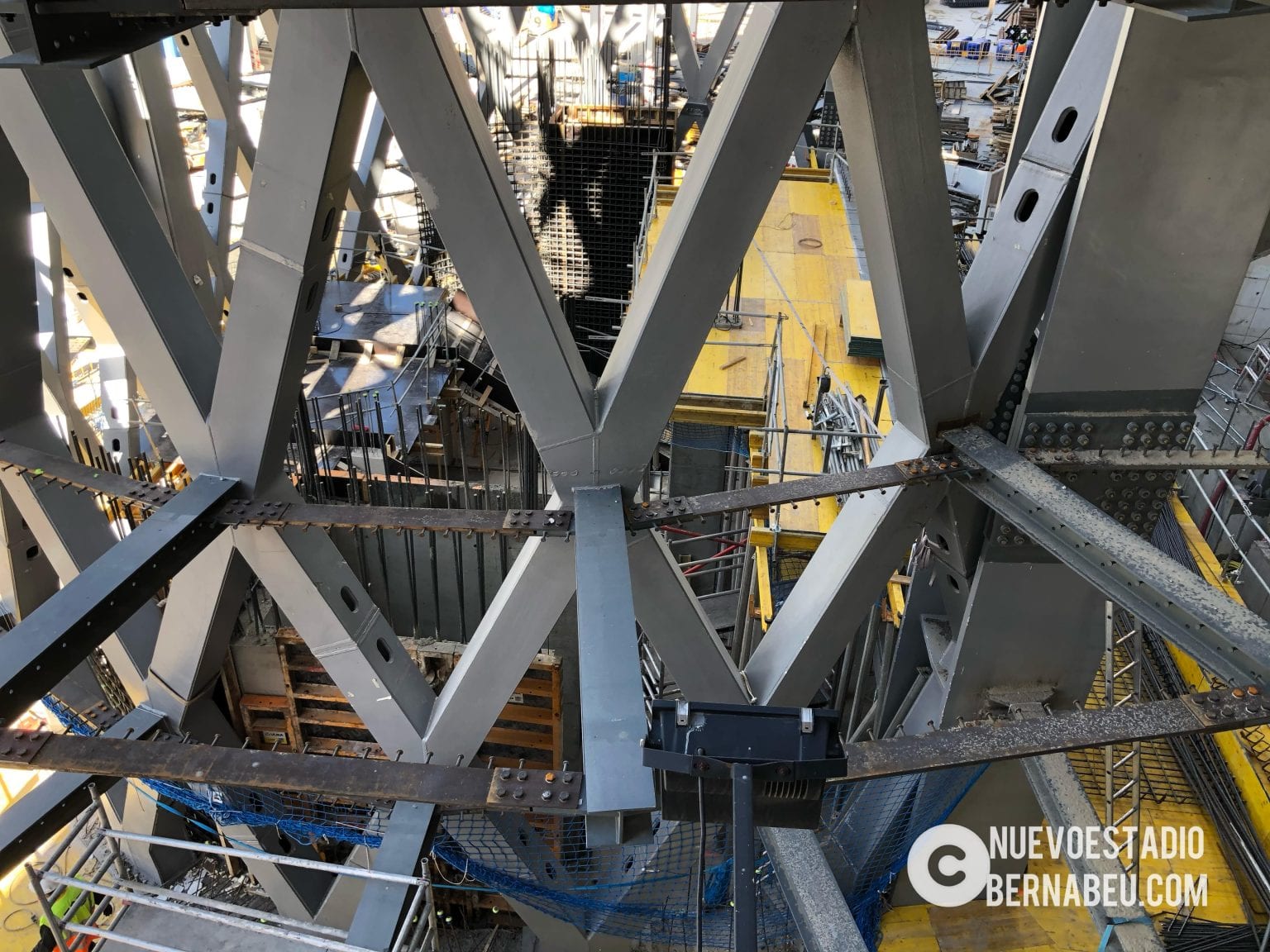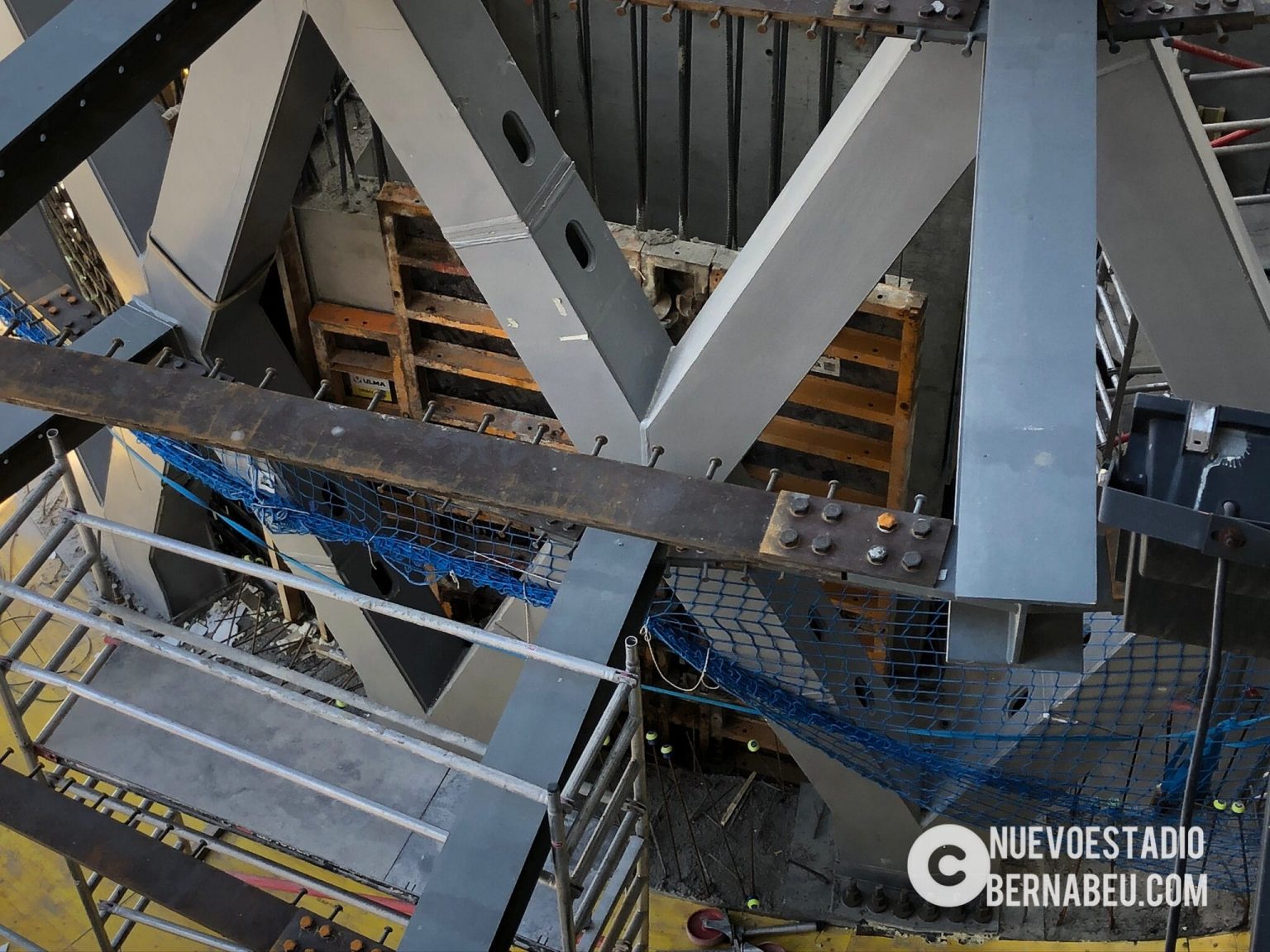 En el interior del bowl se han preparado 6 estructuras (3 en cada fondo) que harán de bases para posicionar sobre ellas las plataformas elevadoras que auxiliarán al anclaje del atirantado de las cerchas.