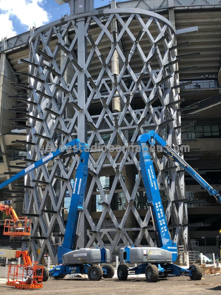 Una de las nuevas actuaciones que se han puesto en marcha en el estadio Santiago Bernabéu es el desmontaje de la cubierta este con inicio de las zonas de aislante en cara exterior de la calle Padre Damián. Como dijimos en la anterior actualización, una de las particularidades de este desmontaje será el retraso de la viga transversal, que a su vez es la de más reciente instalación en el Bernabéu (2002), ya que durante unas semanas se aprovechará esta cercha para las instalaciones de iluminación, audio, conexiones y seguridad.