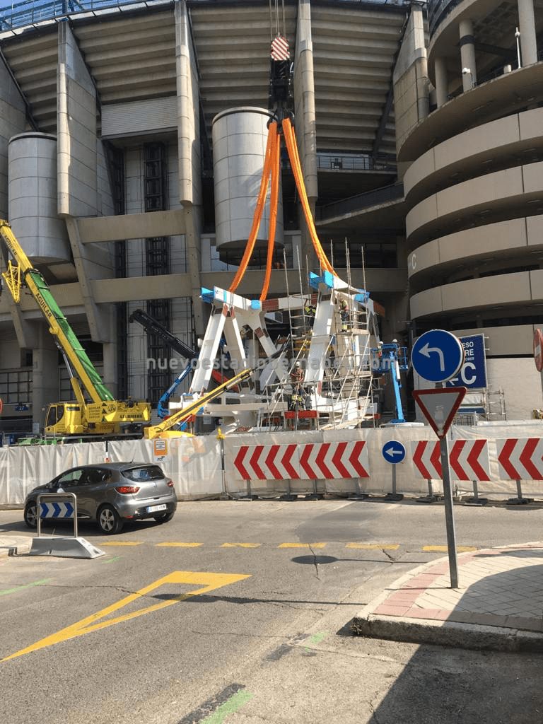 Hombre, el primero que han puesto ha sido el de fuera porque será el que necesiten para anclarlo al suelo, y así poder luego ir poniendo los que crecen hacia dentro del estadio. No es una cuestión de equilibrio de pesos porque hacia fuera ya no va a crecer más. Sólo necesitaban un apéndice para el anclaje al suelo con el tirante.
