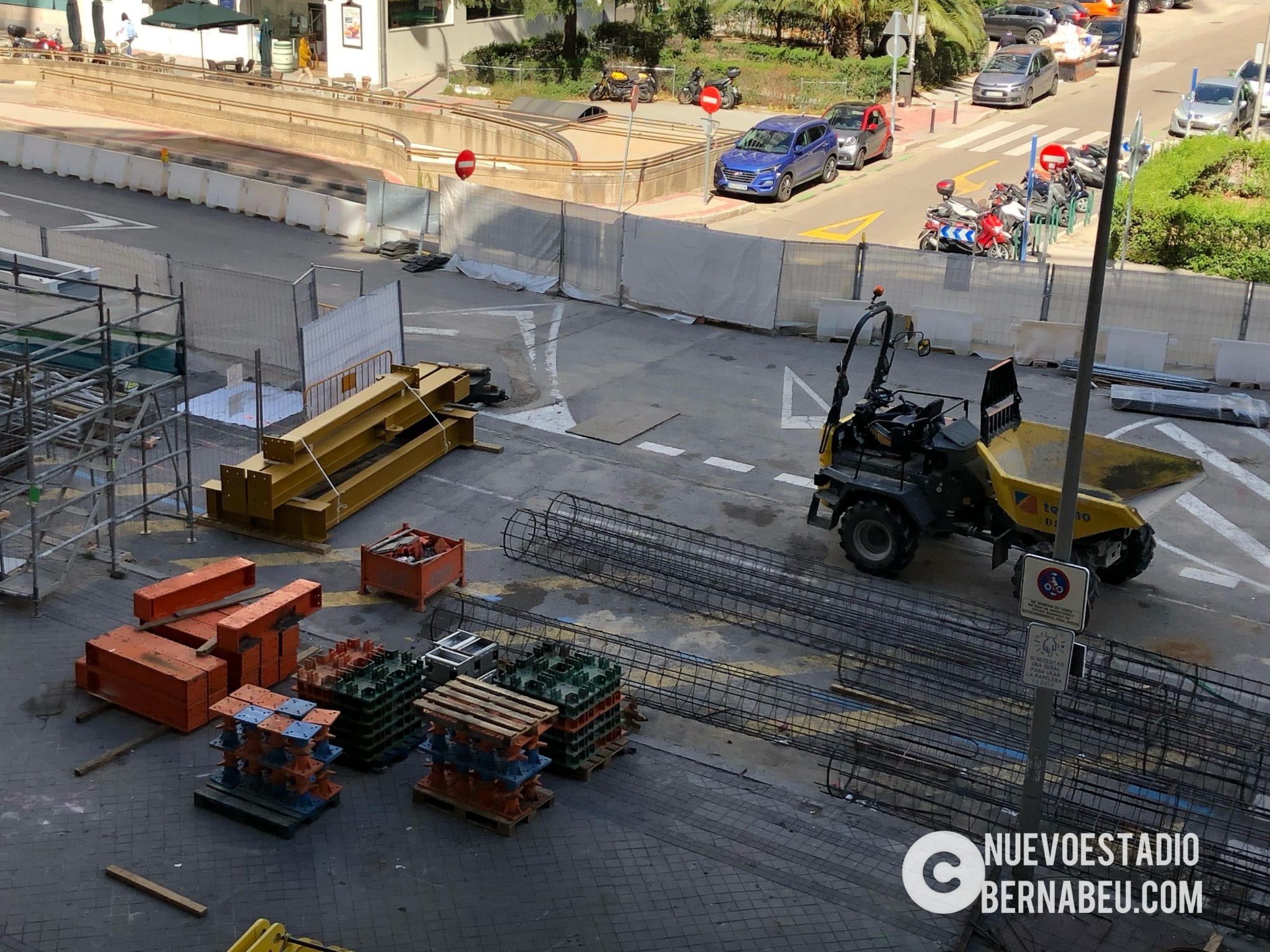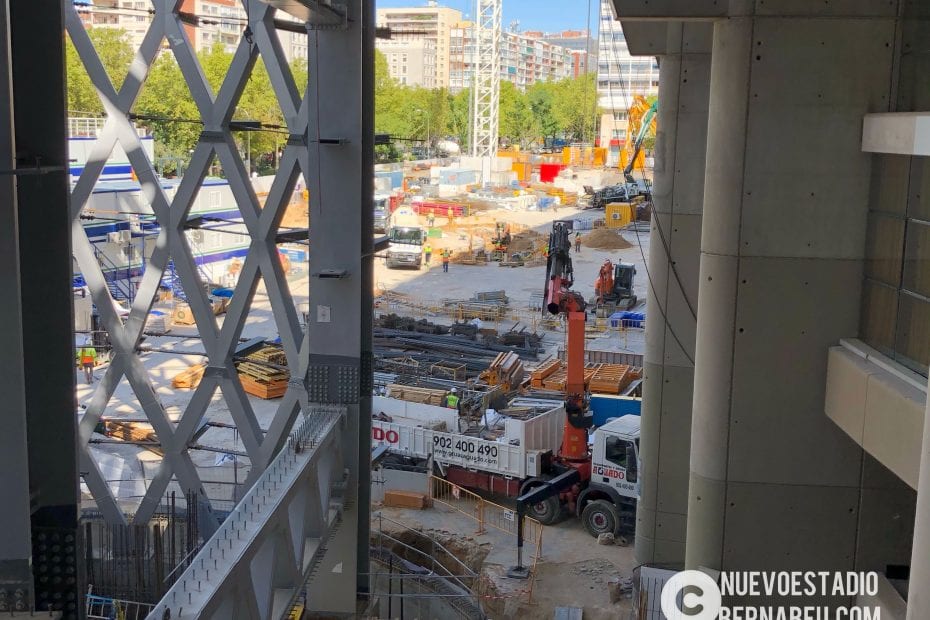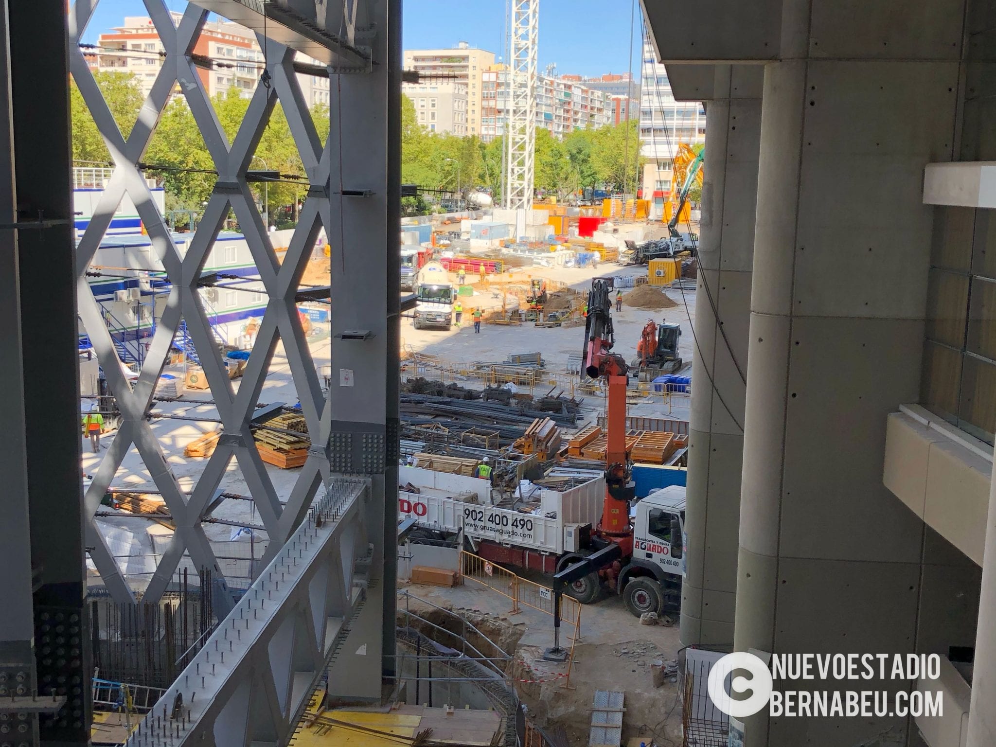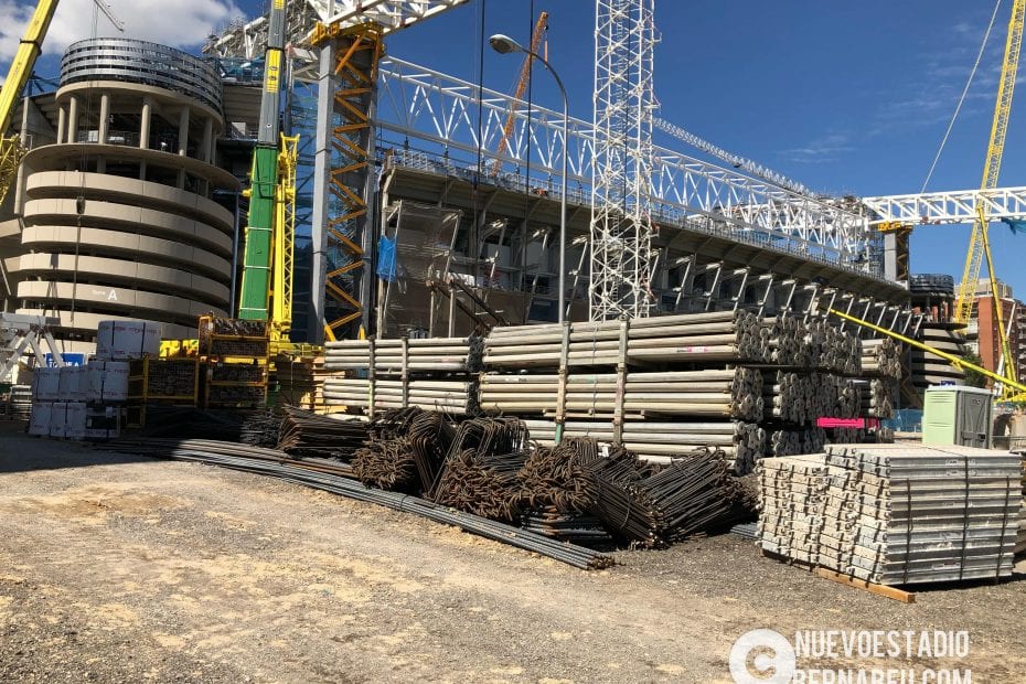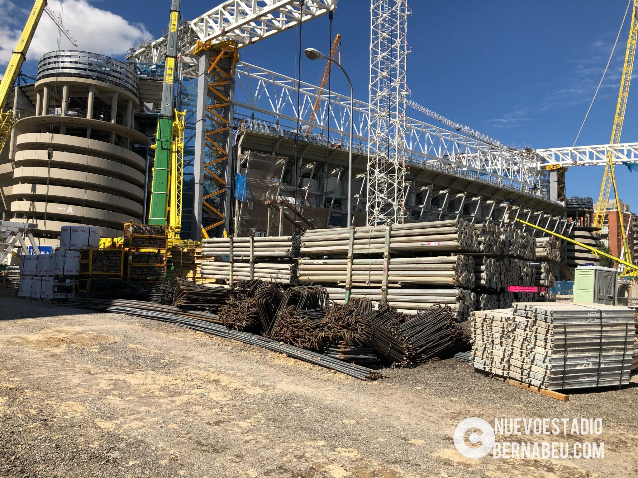 Sorprende la cantidad de actividad que se registra en el campamento de obra frente en la explanada del Paseo de la Castellana. También dentro del bowl se han adelantado trabajos en el encofrado de la grada baja del lateral este.