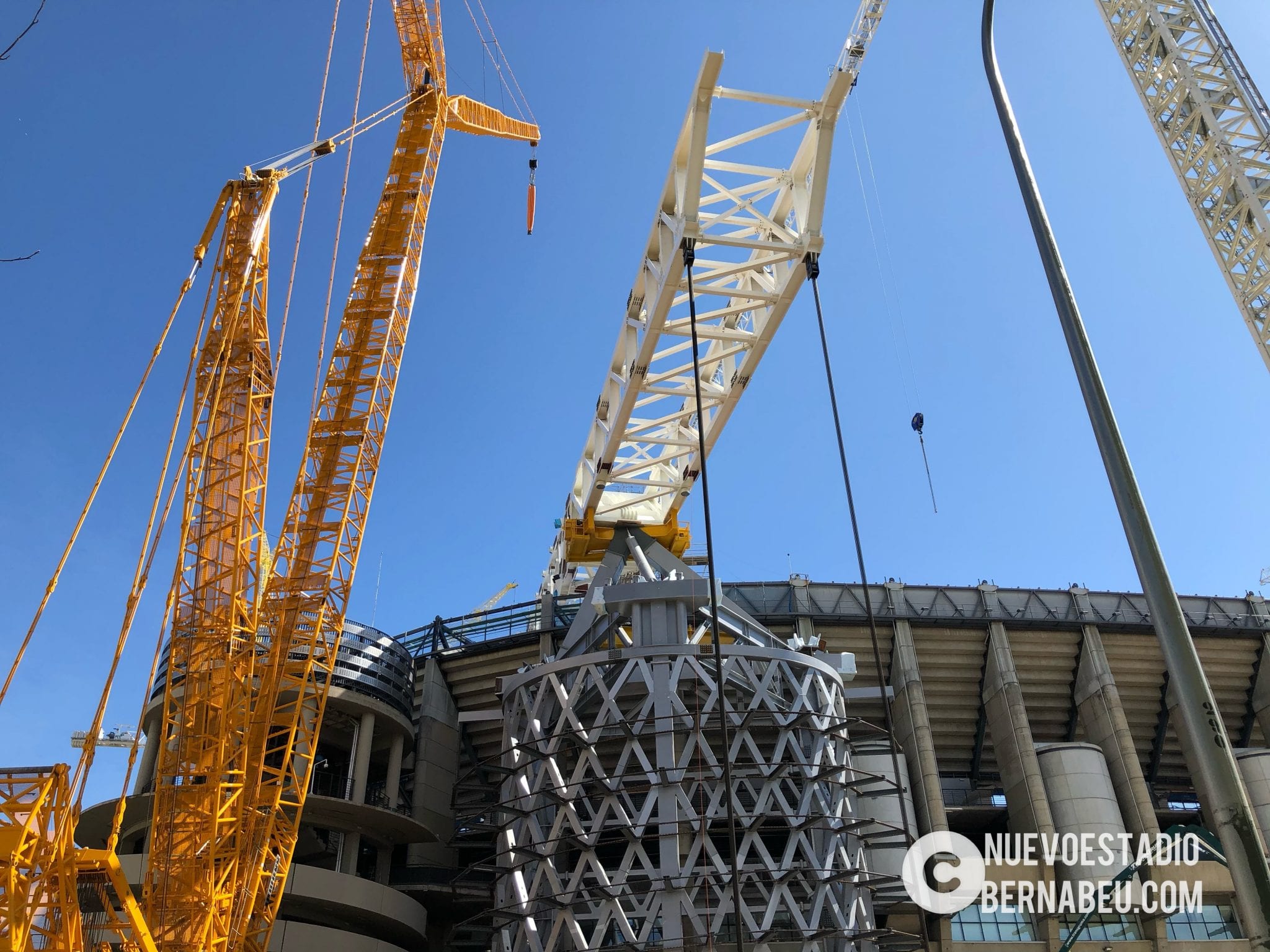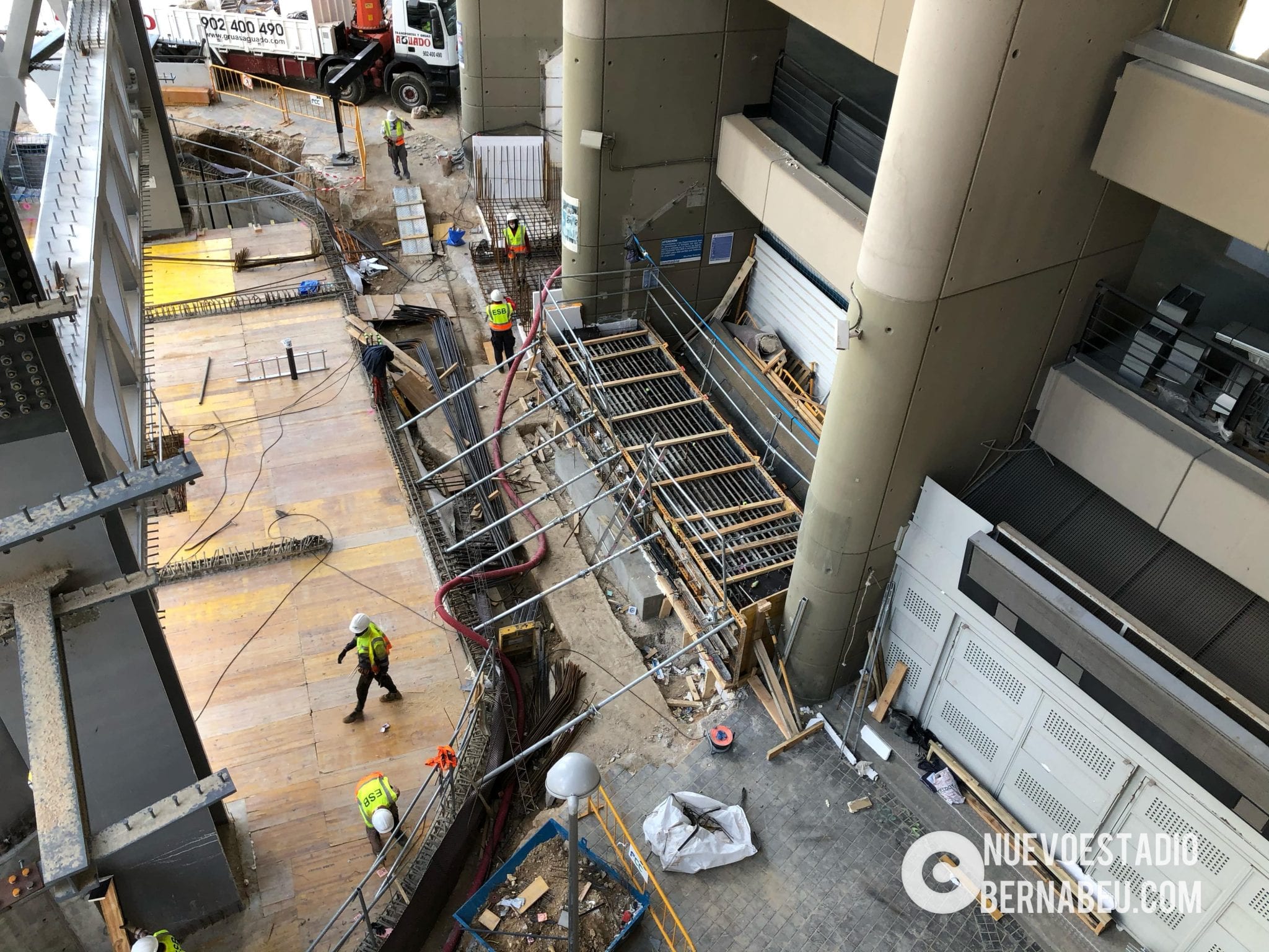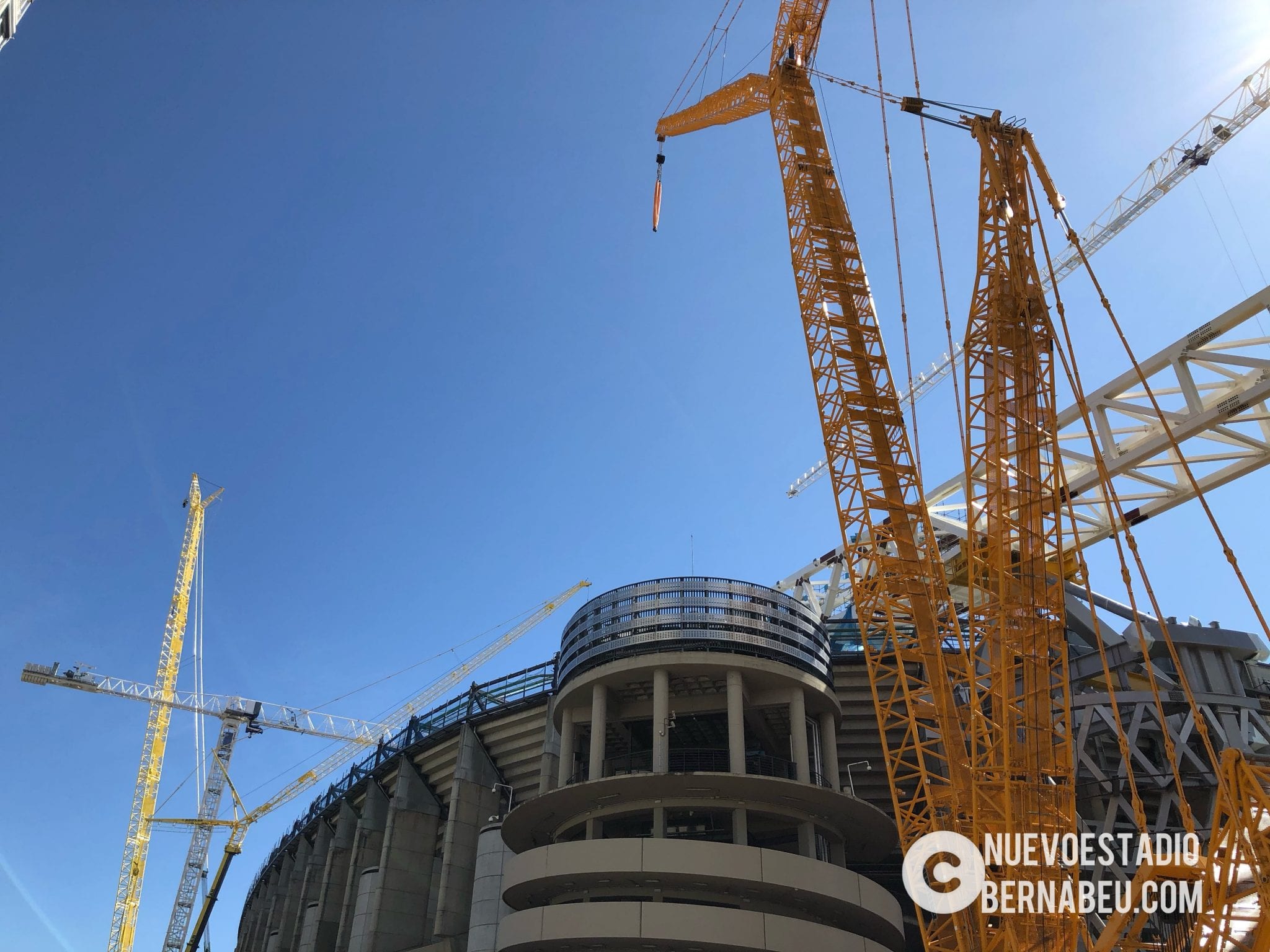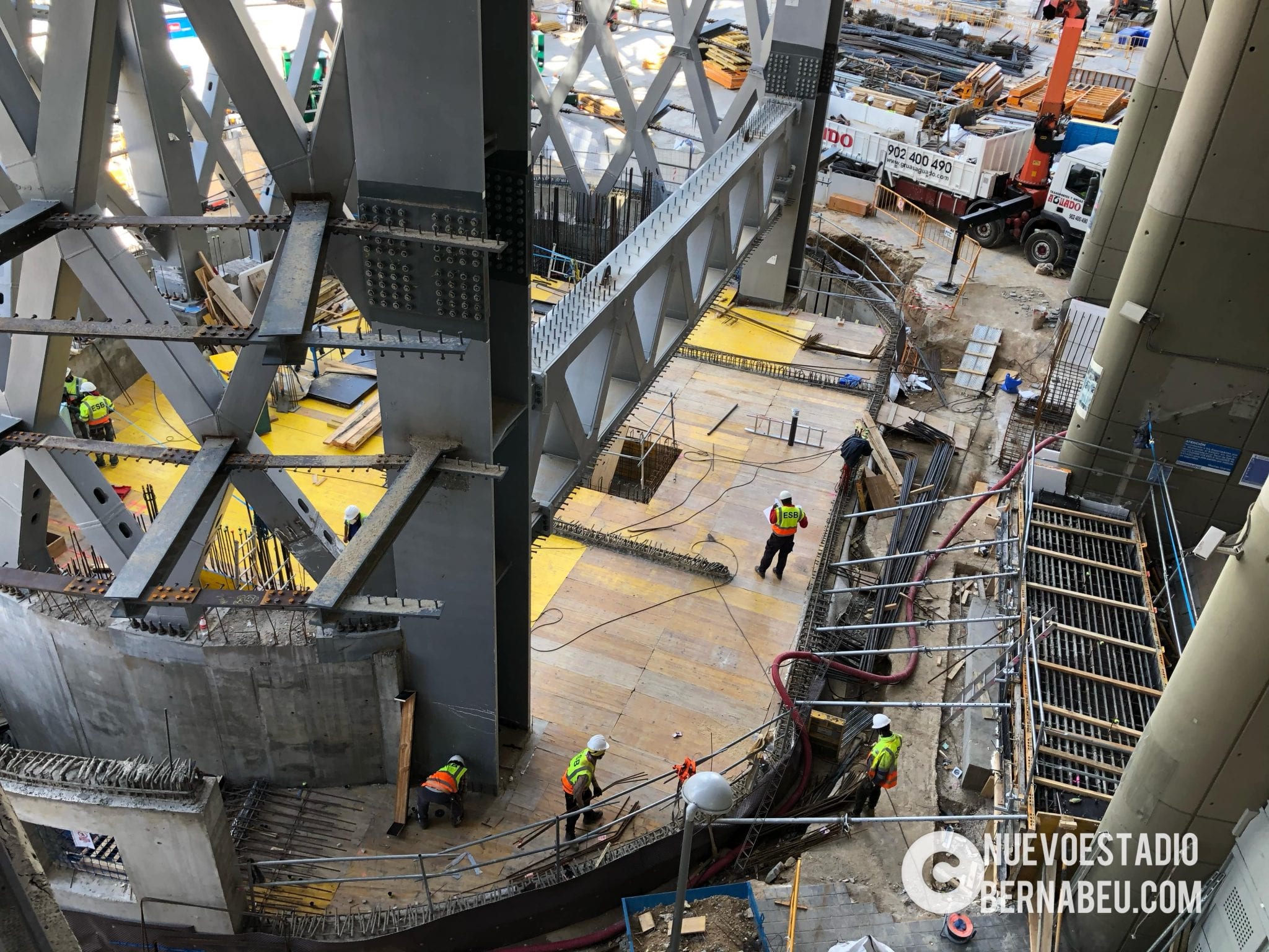 Sorprende la cantidad de actividad que se registra en el campamento de obra frente en la explanada del Paseo de la Castellana. También dentro del bowl se han adelantado trabajos en el encofrado de la grada baja del lateral este.