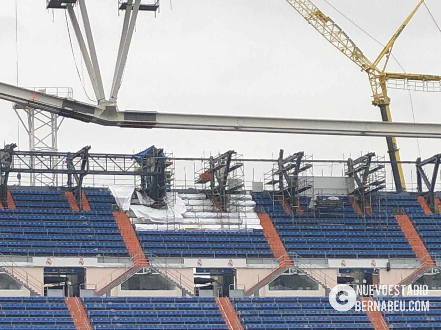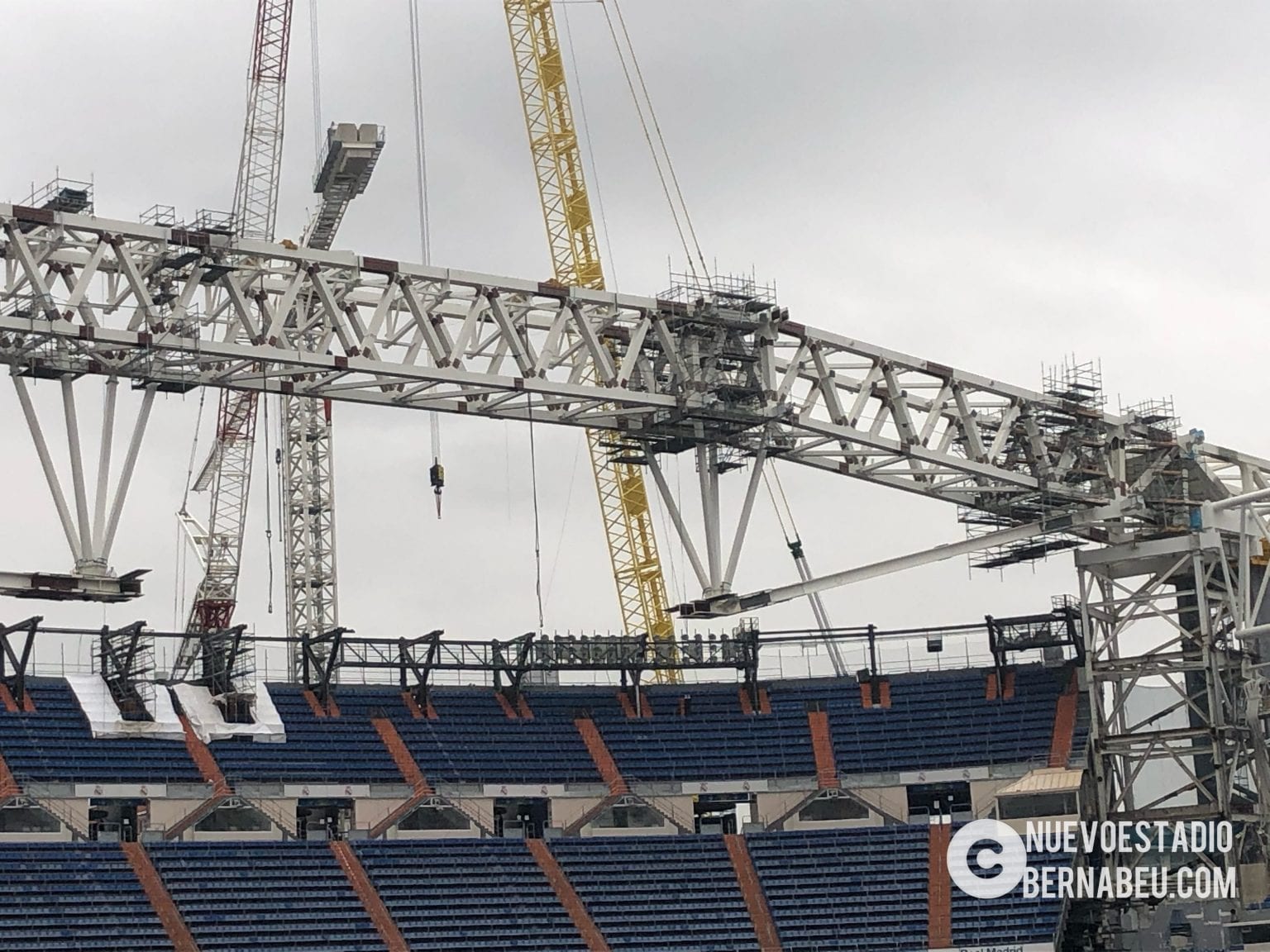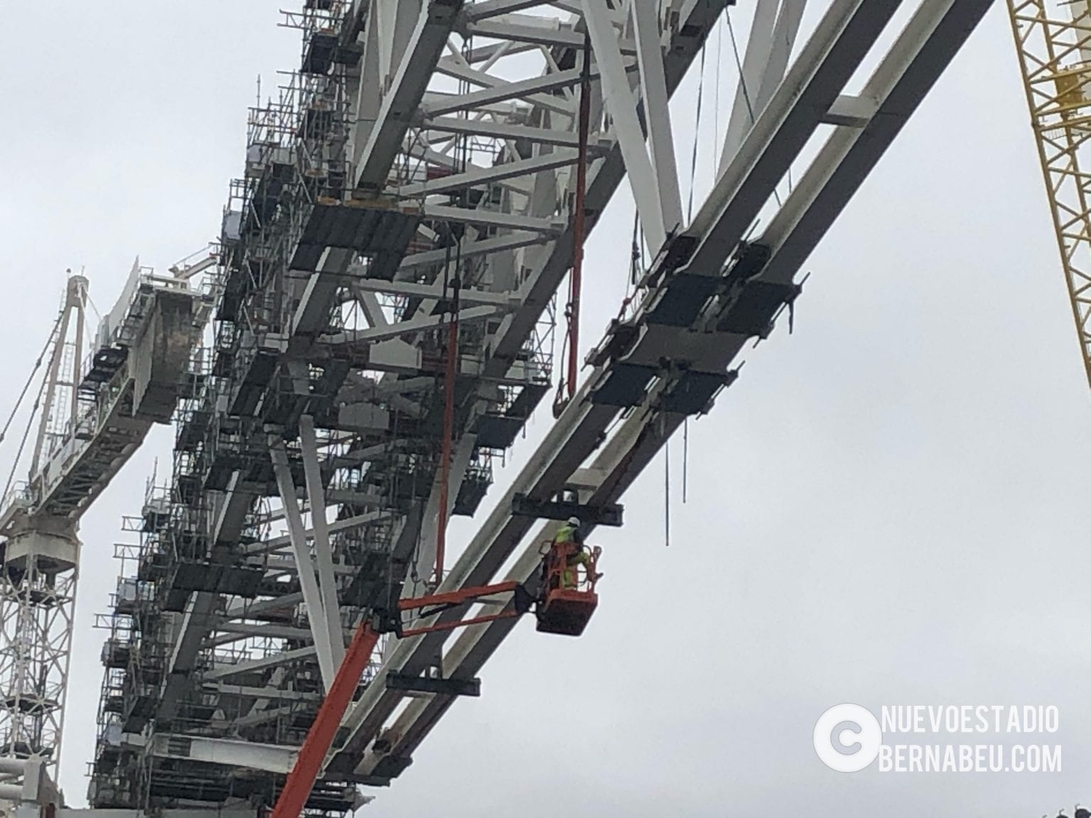 La cercha sur ha quedado completada, una vez izado y apretado el tirante horizontal, a falta de ajustes en los tensores, los cuales se llevarán a cabo en las próximas horas. En la cercha norte ya se ha izado y apretado el tirante horizontal D el cual estaba en obra preparado a falta de ajuste de logística con las grúas y de ocupación de vial público.