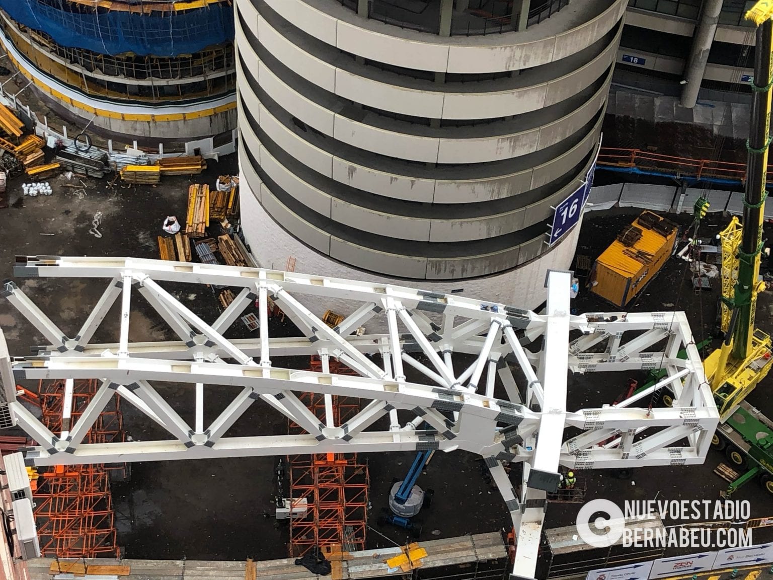 Aparcamiento del lateral este es sus distintas fases, montaje a pie de obra de las extensiones de arranque de las cerchas transversales, armado de la plataforma auxiliar sobre la que se construirán las cerchas transversales que servirán de sustento de la nueva cubierta fija…