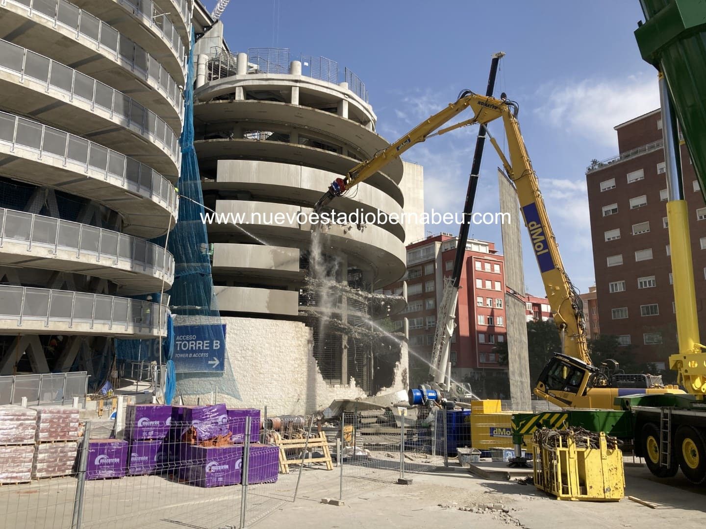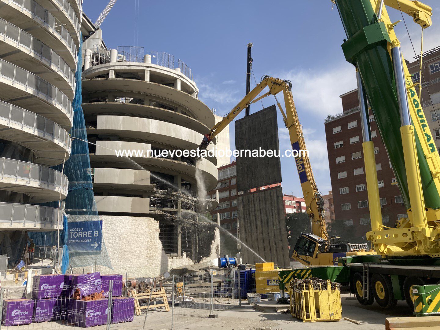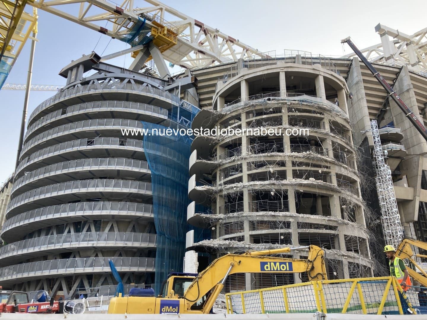 En cuanto al resto de actuaciones, se trabaja en la demolición con maquinaria pesada de la antigua torre B y a partir de mañana miércoles se procederá de la misma manera en la antigua torre C. El objetivo, es tener las antiguas torres en el suelo a finales de este mes de agosto. Se continúa con la habilitación de espacios y para ellos se ha procedido a la demolición de palcos de familiares de jugadores, palcos en nivel 1 del lateral oeste y con la demolición de tramos de escaleras en sectores del fondos norte y fondo sur.