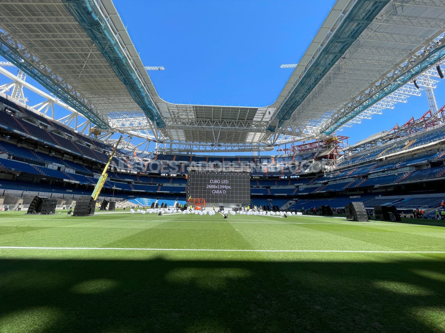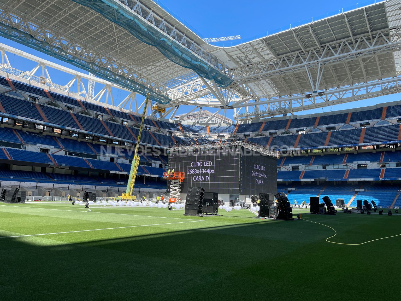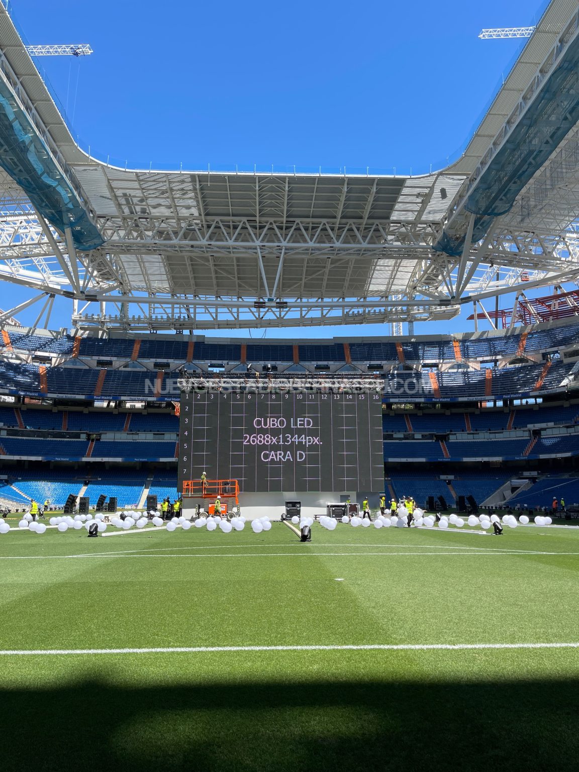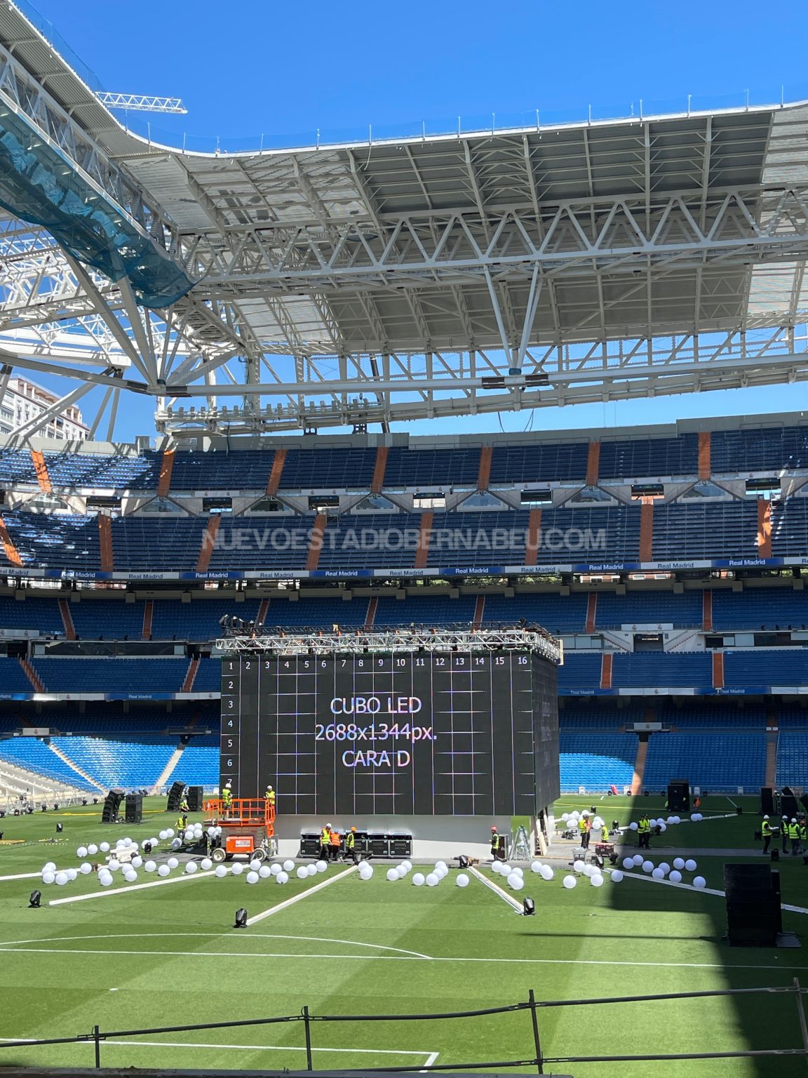 Todo listo en el Santiago Bernabéu para acoger al madridismo durante la final de Champions. Desde ayer lunes se ha trabajado a destajo en la instalación del cubo de pantallas en el Santiago Bernabéu, lugar de encuentro de socios y madridistas para ver y apoyar al equipo en la final que disputamos el sábado en París contra el Liverpool.