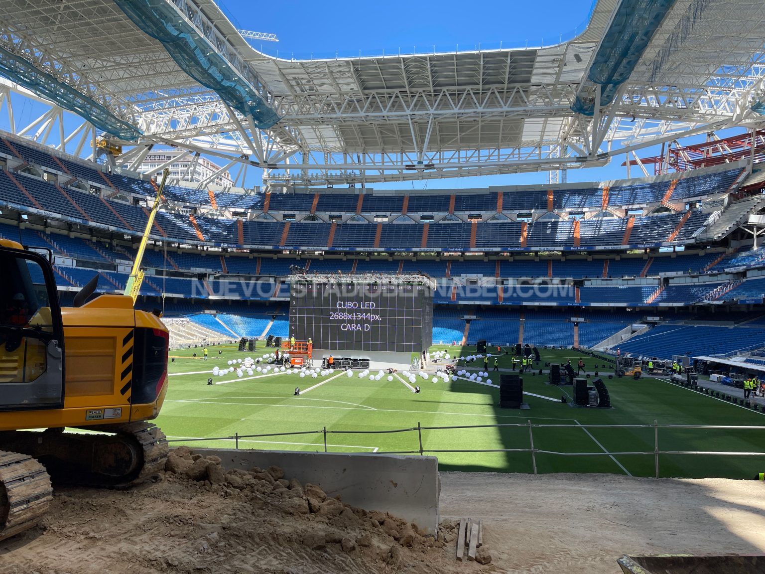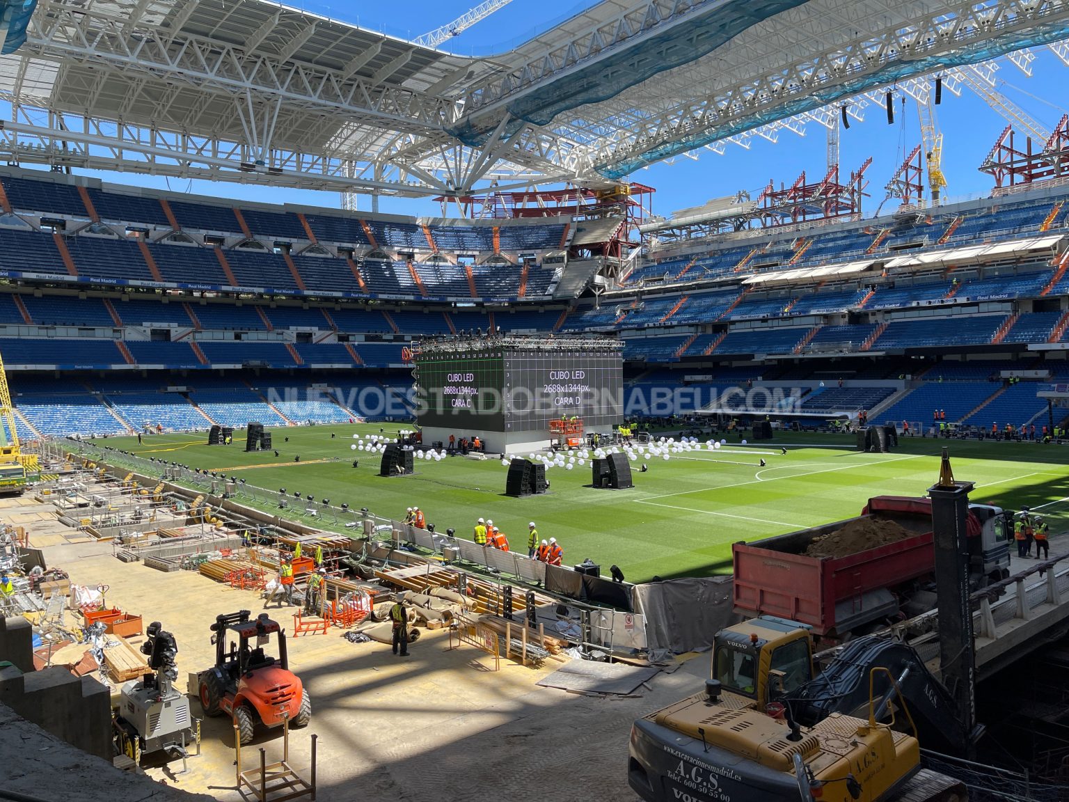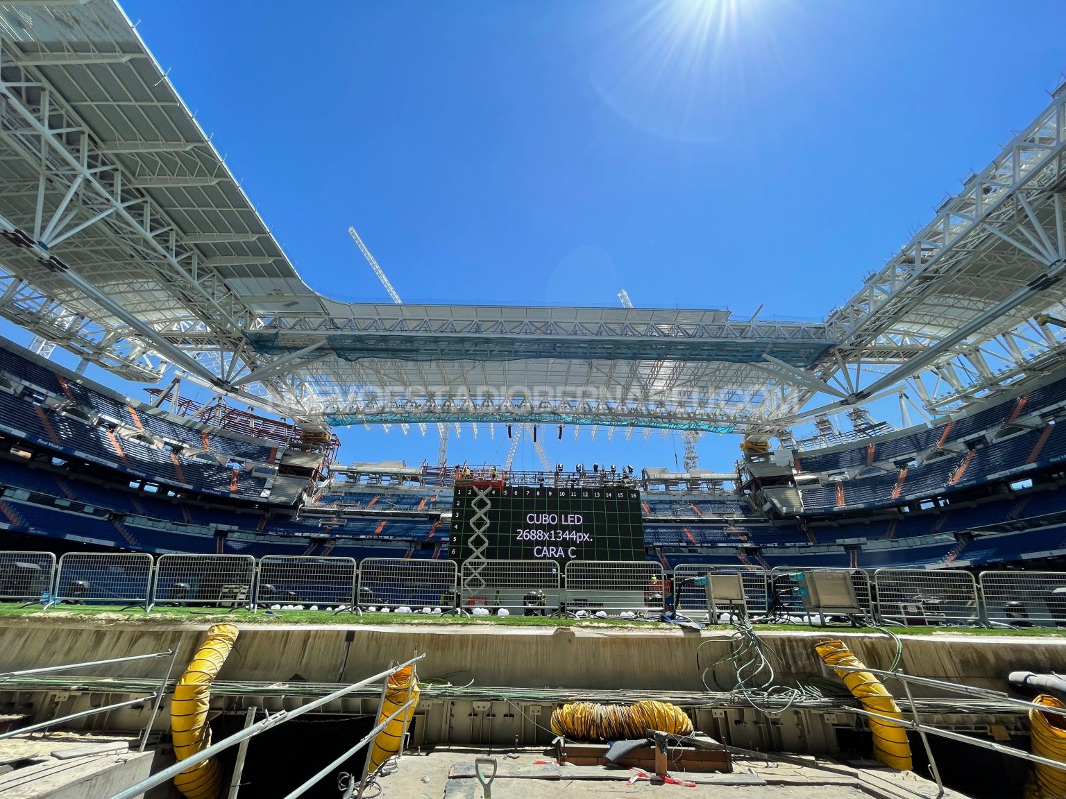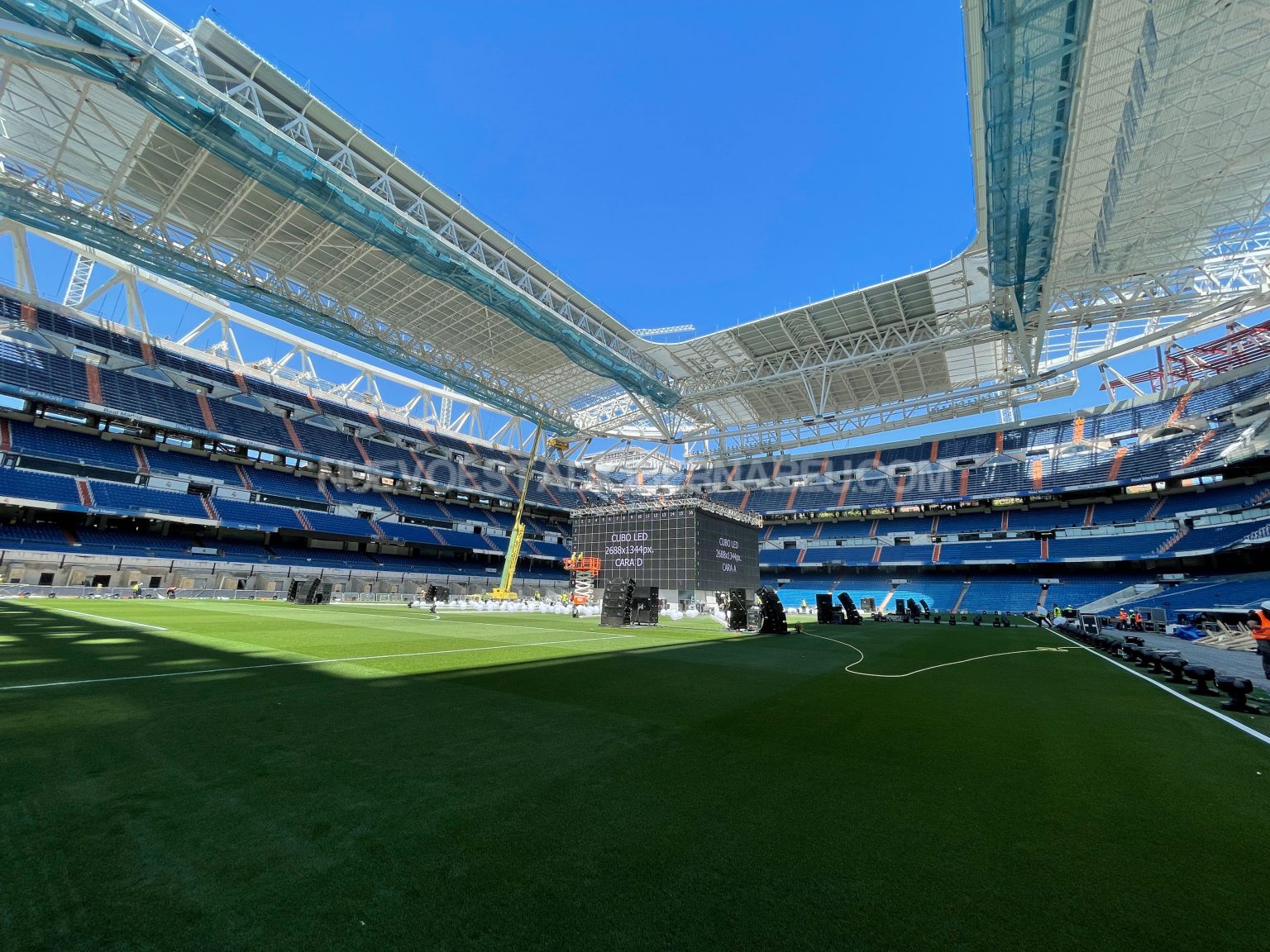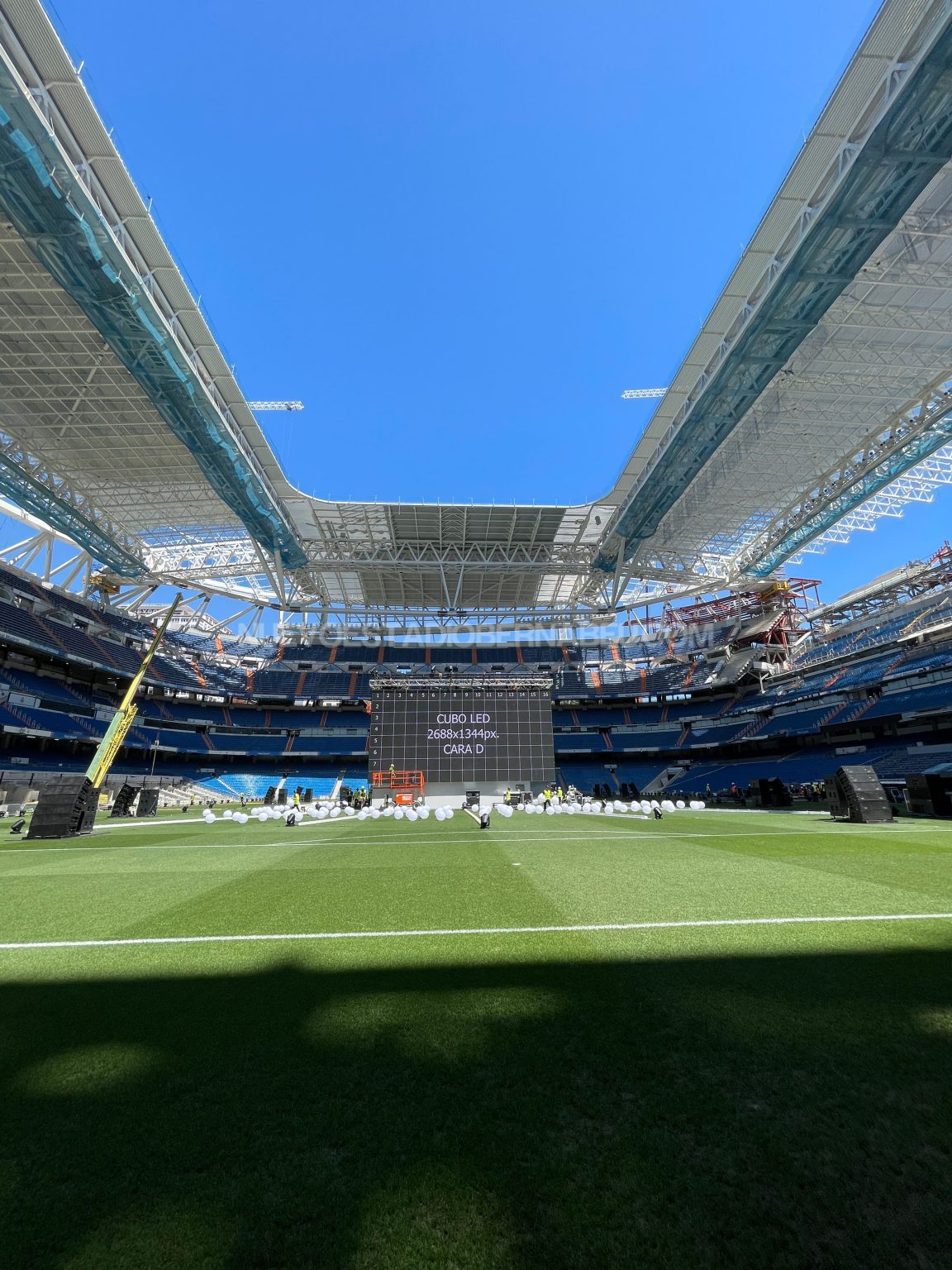Todo listo en el Santiago Bernabéu para acoger al madridismo durante la final de Champions. Desde ayer lunes se ha trabajado a destajo en la instalación del cubo de pantallas en el Santiago Bernabéu, lugar de encuentro de socios y madridistas para ver y apoyar al equipo en la final que disputamos el sábado en París contra el Liverpool.