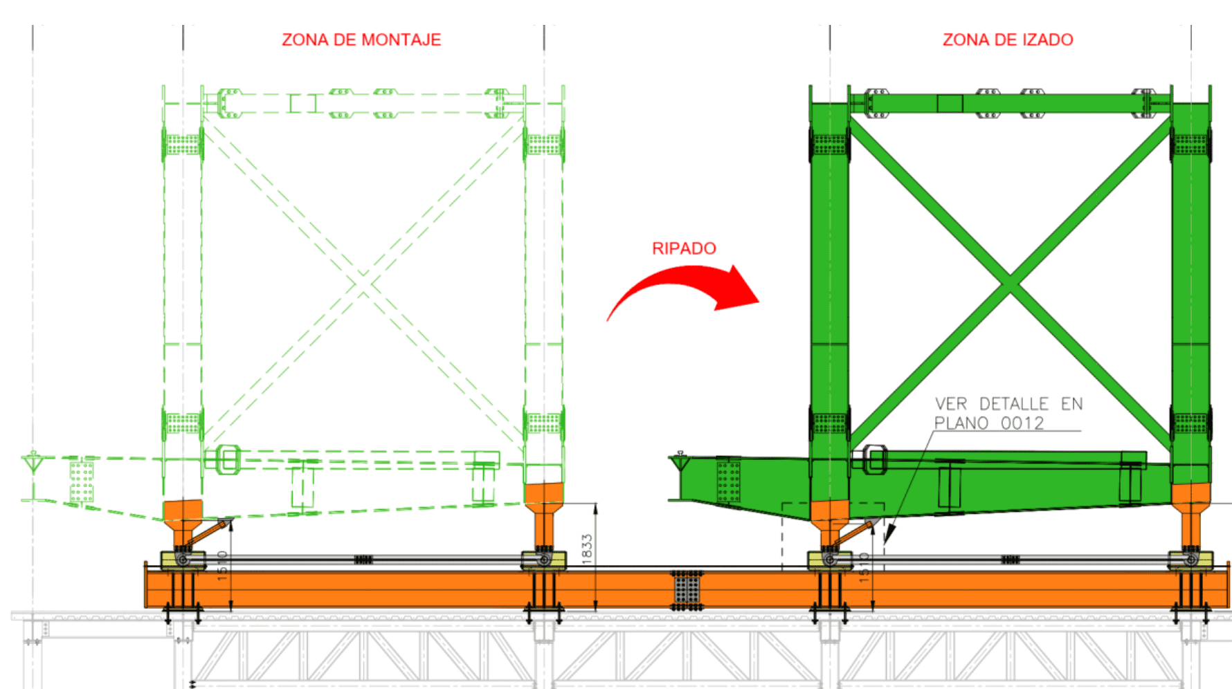 Una vez ejecutado con éxito el izado de la cercha lateral este y la posterior transferencia de las cargas a